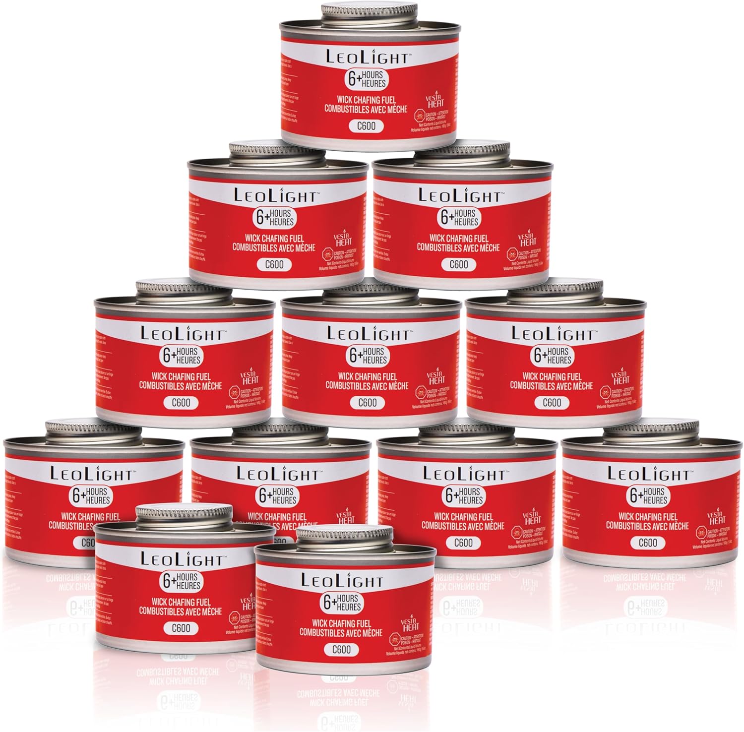 LeoLight chafing fuel delivers clean-burning, odorless heat for up to 6 hours, perfect for buffets, weddings, parties, banquets, and catering services. Our canned heat fuel with a wide-pad wick provides even, consistent heat without hot spots. Each resealable pop-top can is independently tested for safe indoor and outdoor use and is compatible with standard buffet servers, stainless steel chafing dishes, wire racks, catering pans, and food warmers.