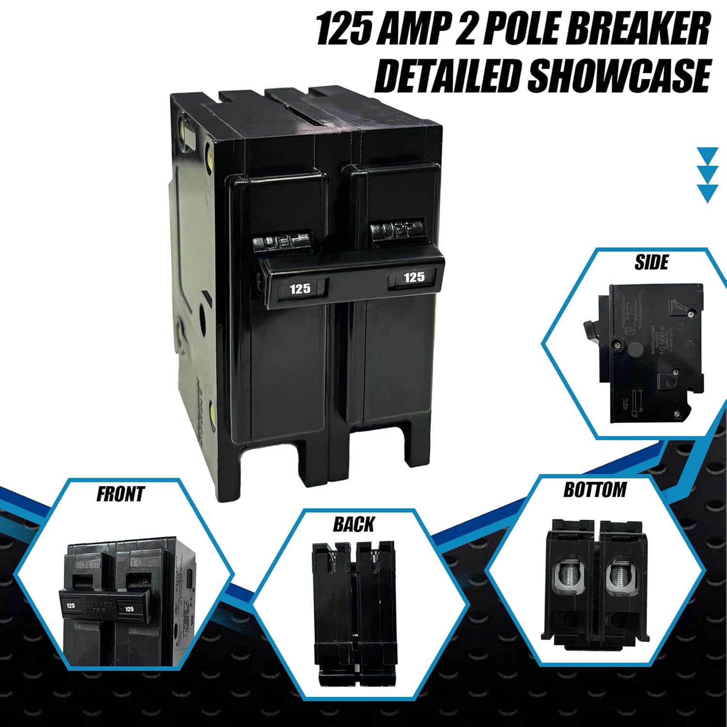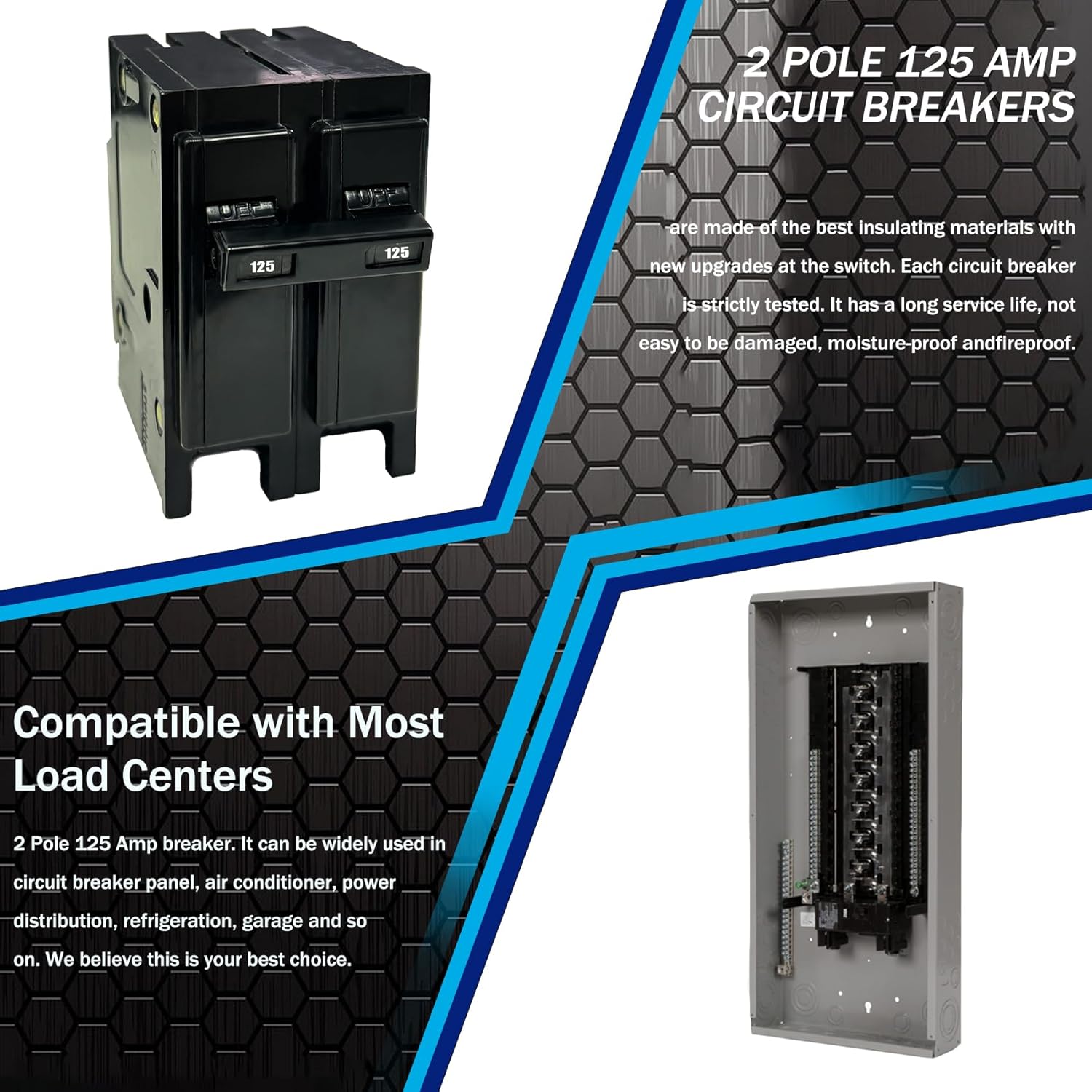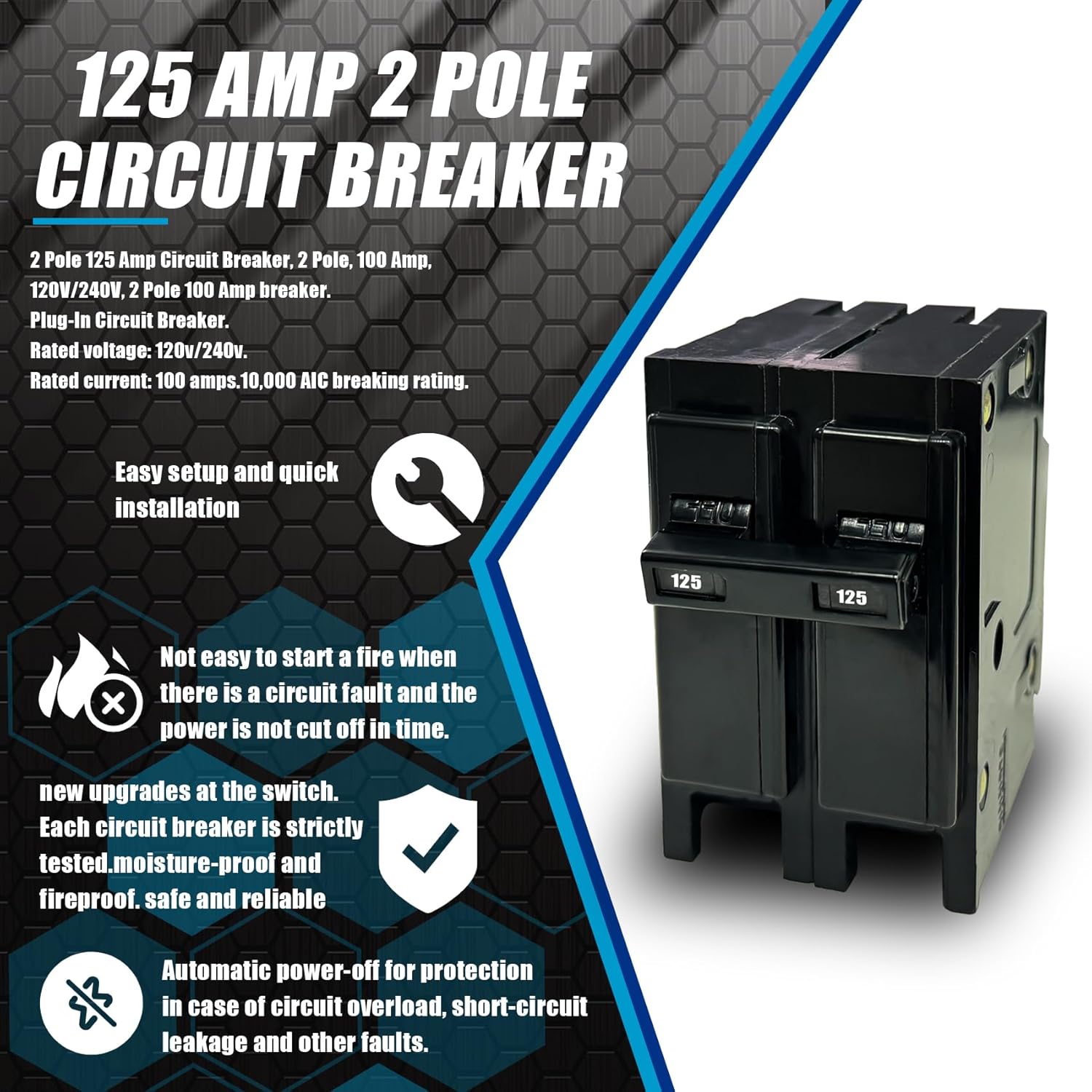 TOP QUALITY: Our 2 Pole 125 Amp circuit breakers are made of the best insulating materials with new upgrades at the switch. Each circuit breaker is strictly tested. It has a long service life, not easy to be damaged, moisture-proof and fireproof. We believe this is the last time you will replace your circuit breaker.