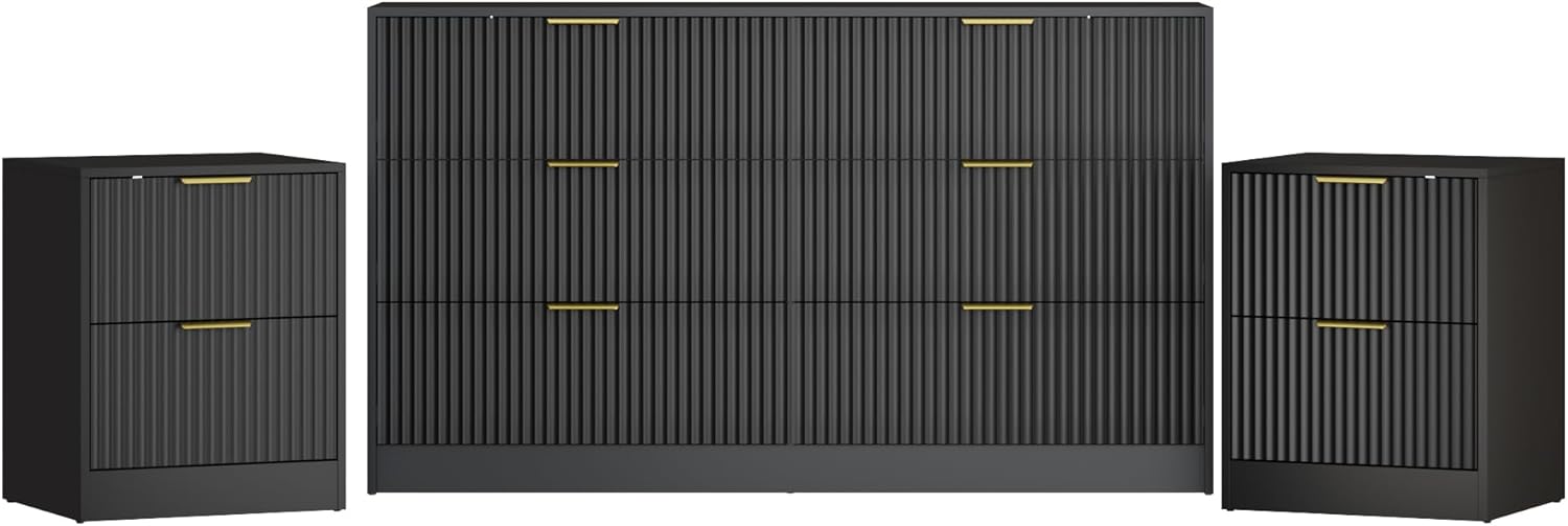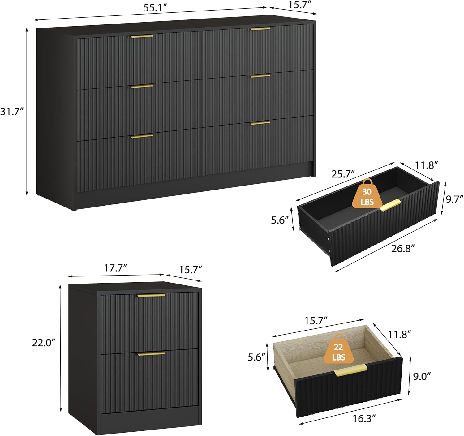 【Generous Storage Capacity】Included 1PC 6 drawer dresser and 2PCS nightstand, provide spacious storage for your clothing and accessories. The 6 drawer dresser measures: 55.1”L x 15.7”W x 31.7”H, each drawer can hold a maximum of 30 pounds. Nightstand set of 2 measures: 17.7”L x 15.7”W x 22”H, while each nightstand includes two drawers.
