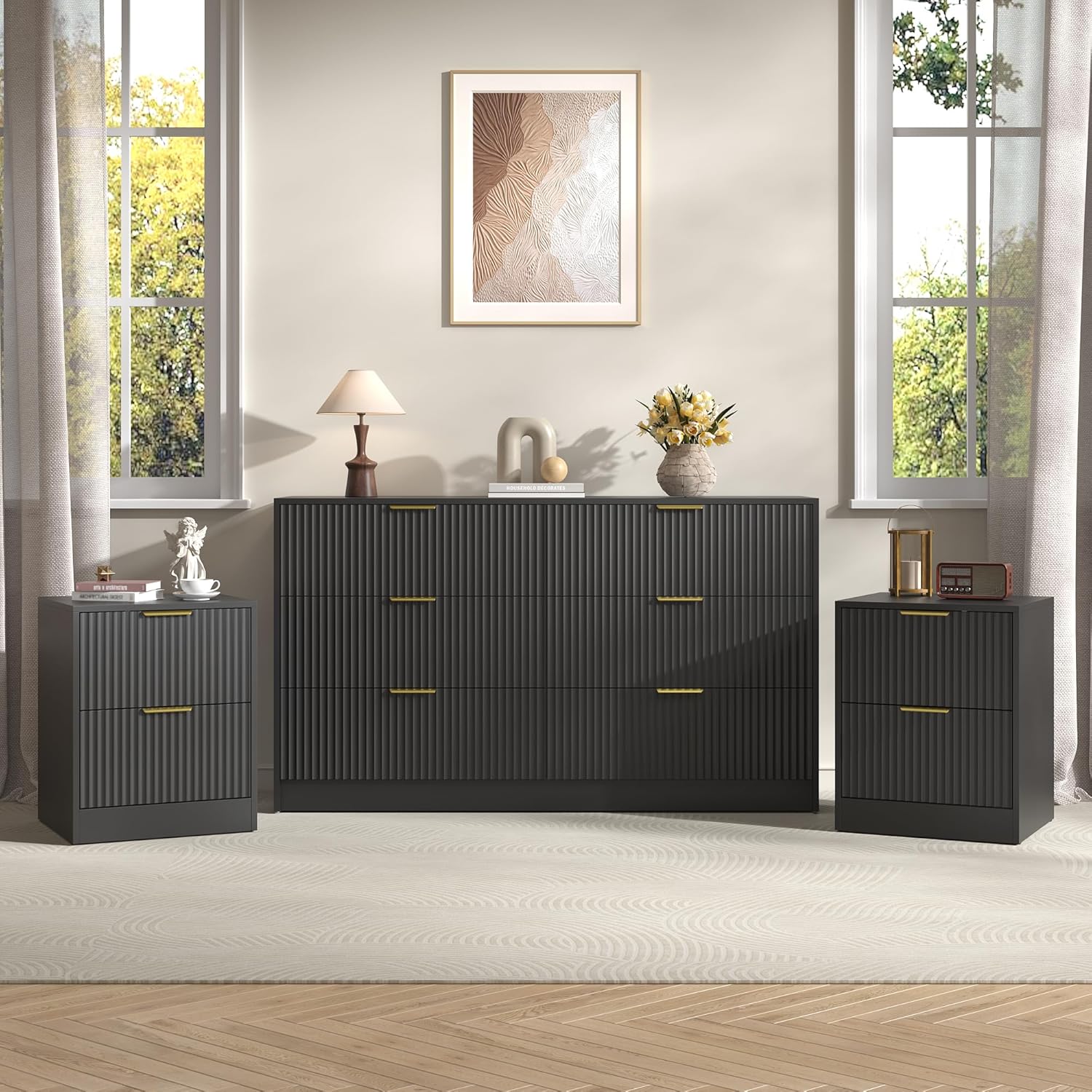 【Floor Standing Base Design】This dresser and nightstand set features a floor standing base design and is equipped with an anti tipping device, delivers lasting stability and balance on any surface. The smooth curved edge design adds a refined touch while ensuring safety from sharp corners.