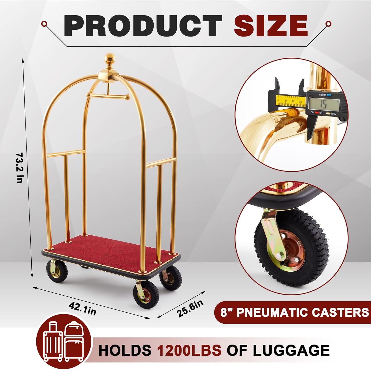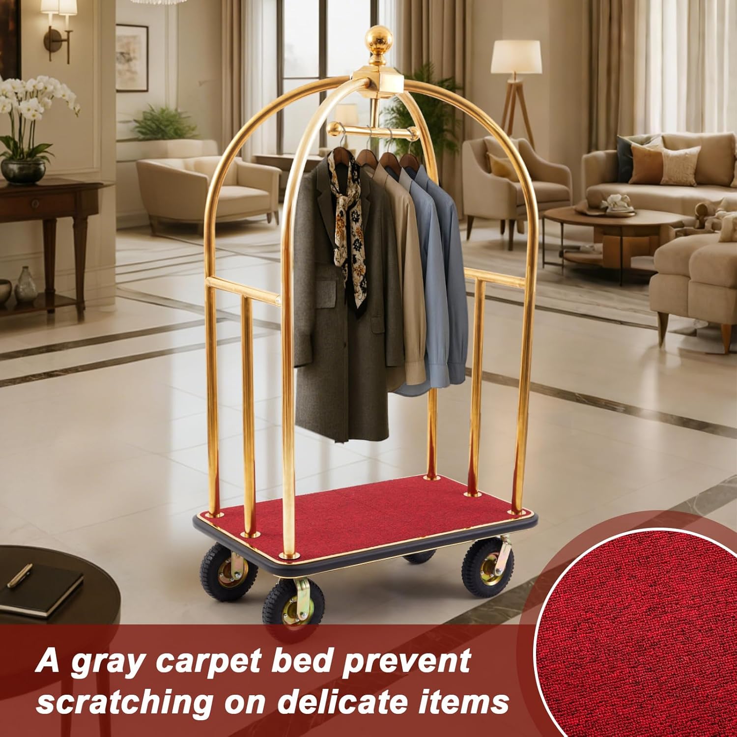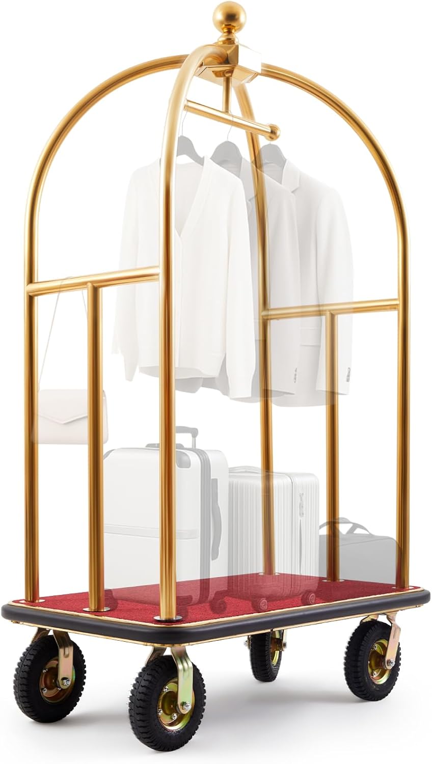 Multi-Functional Gold Utility Cart: the gold rolling cart includes a built-in clothing hanger for hanging garments and a non-slip red carpet base to secure luggage; Its versatile design makes it suitable as a luggage cart for air travel or hotel baggage handling