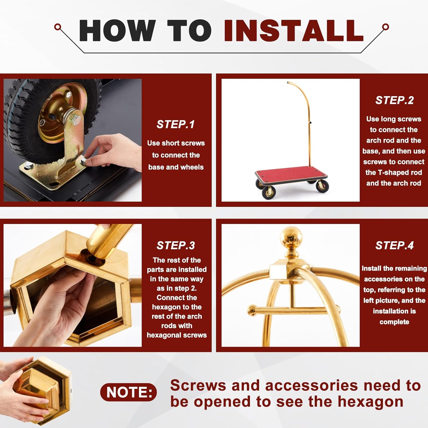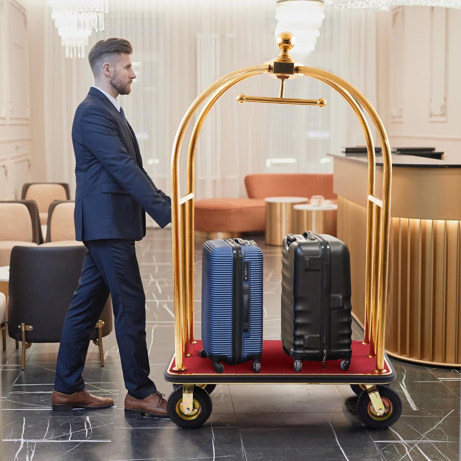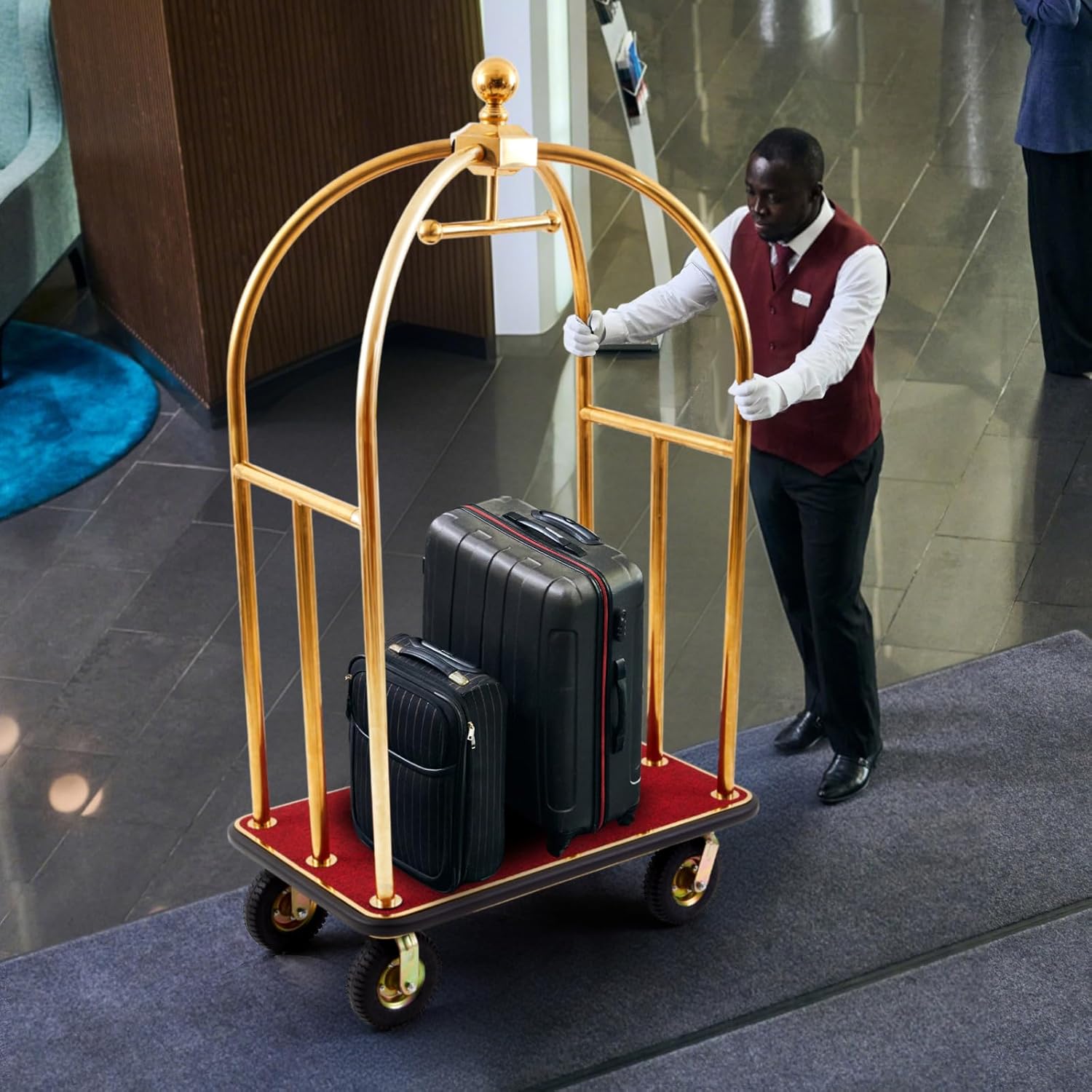 Ideal for Commercial & Travel Use: whether for hotels, airports, or resorts, this luggage cart with wheels streamlines luggage transport; Its gold utility cart design blends functionality with aesthetics, ensuring efficient service in high-end settings