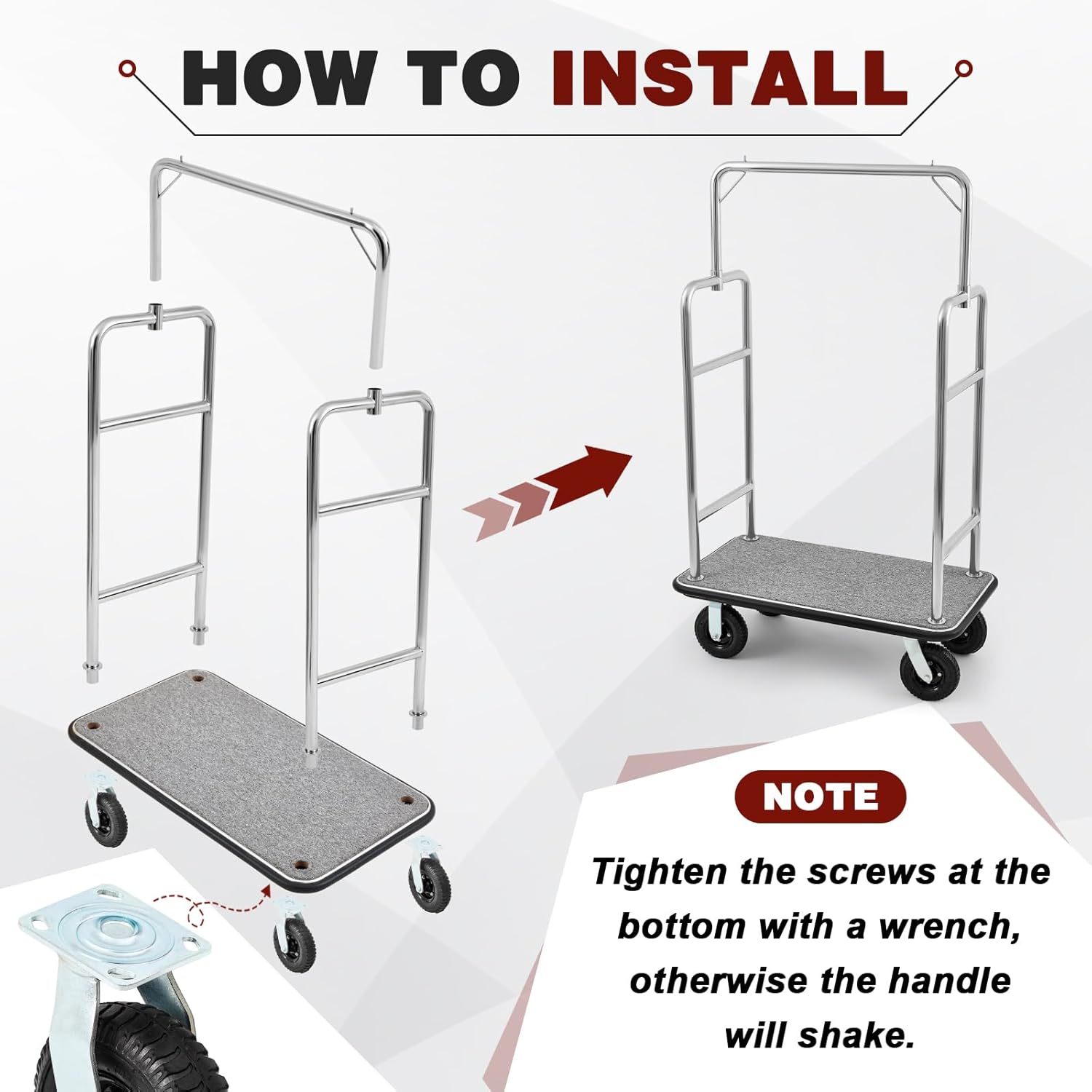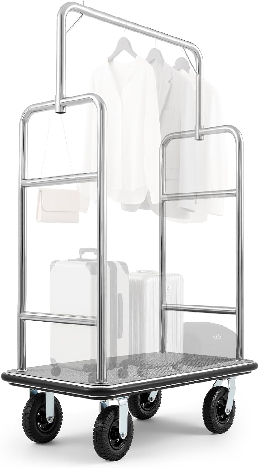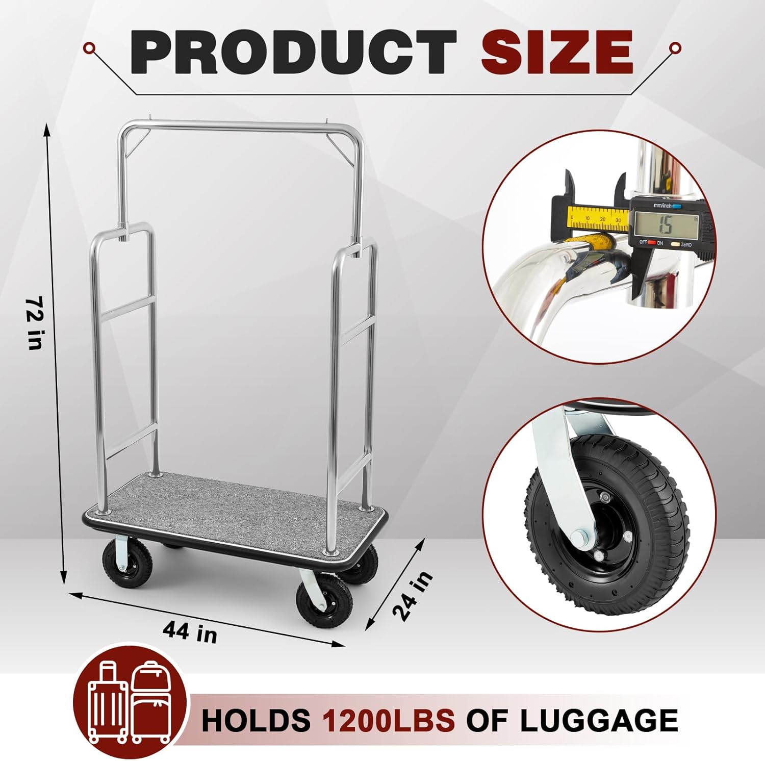 Robust Bellman Cart: this hotel luggage trolley is built with heavy duty stainless steel and a 1.5 inch welded frame, offering unmatched durability; Capable of carrying up to 1200 pounds, it effortlessly caters to the needs of hotels, airports, and event venues; Its silver and black design ensure that this luggage carrier not only supports your guests’ heaviest luggage but also complements the most sophisticated settings