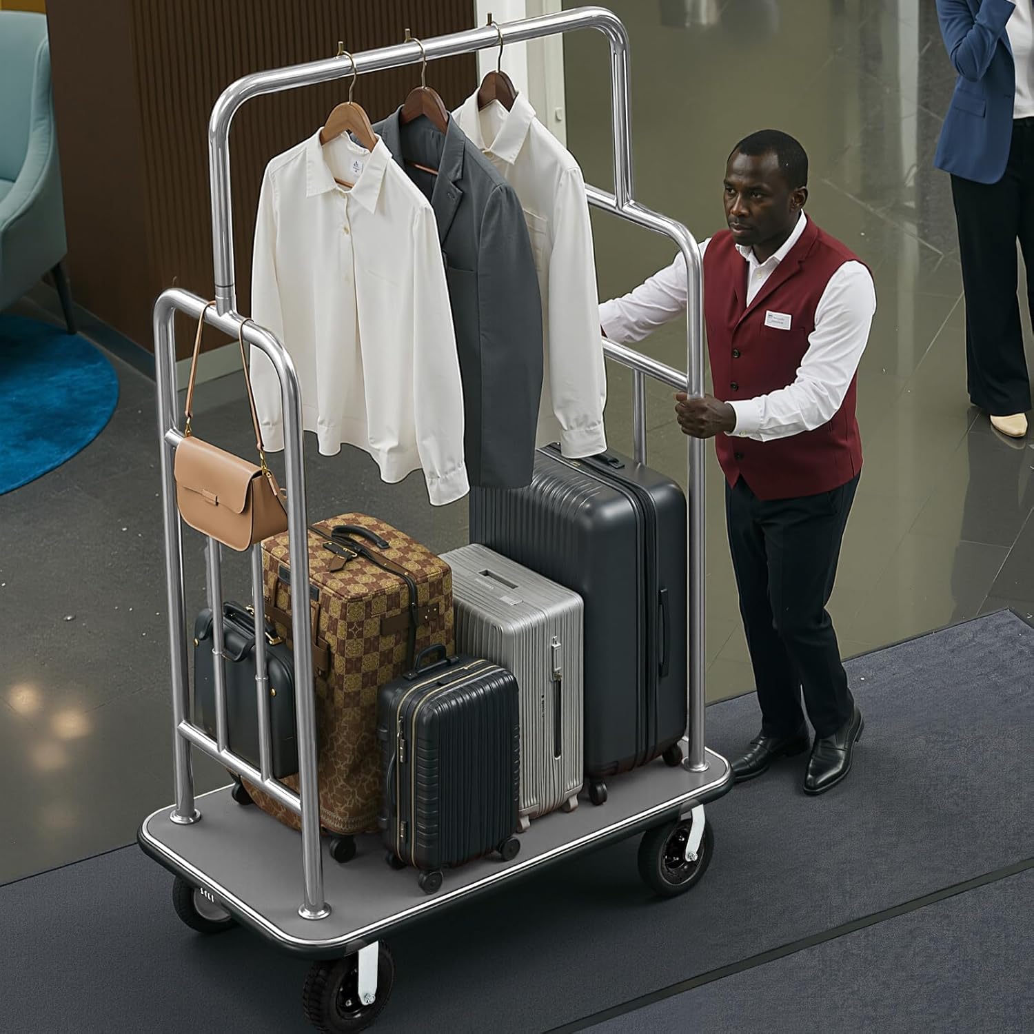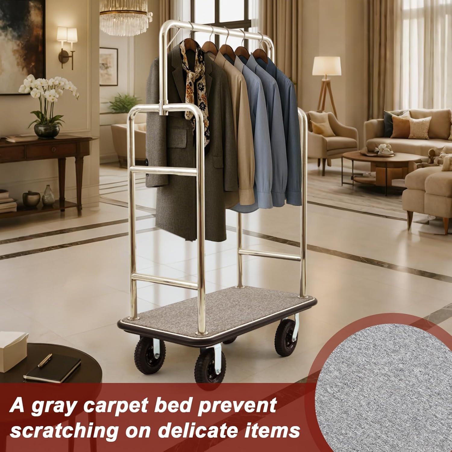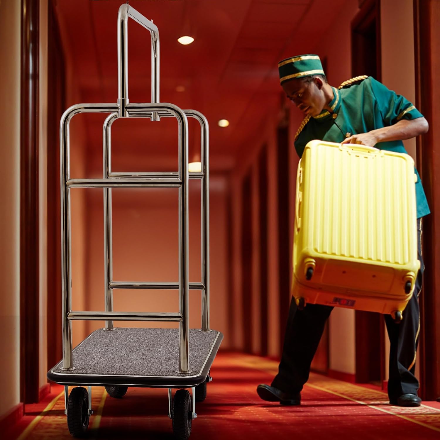 Elegance That Endures: featuring a brushed stainless steel finish combined with a stain resistant carpet, this luggage cart stands as a model of sophisticated durability; Suitable for hotels, airports, and resorts, its sleek appearance not only guards against wear and tear but also enhances your professional aesthetic of concierge and valet services