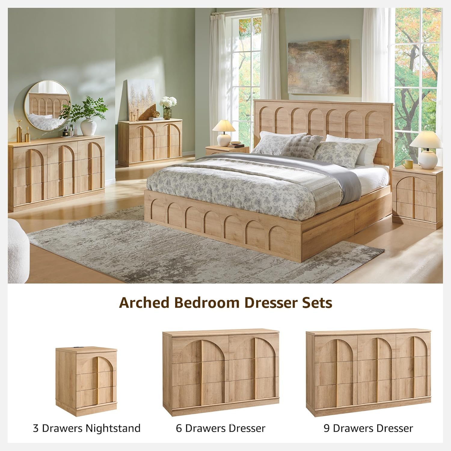Morden Bed Frame with Storage: Featuring a weathered wood veneer that highlights its unique, rustic texture. The headboard and footboard are beautifully designed with graceful arched recessed carvings, showcasing fine craftsmanship. With four spacious drawers for convenient storage, this bed offers both ample space and visual appeal. Its simple yet sophisticated design effortlessly blends functionality with elegance, making it an ideal addition to any bedroom