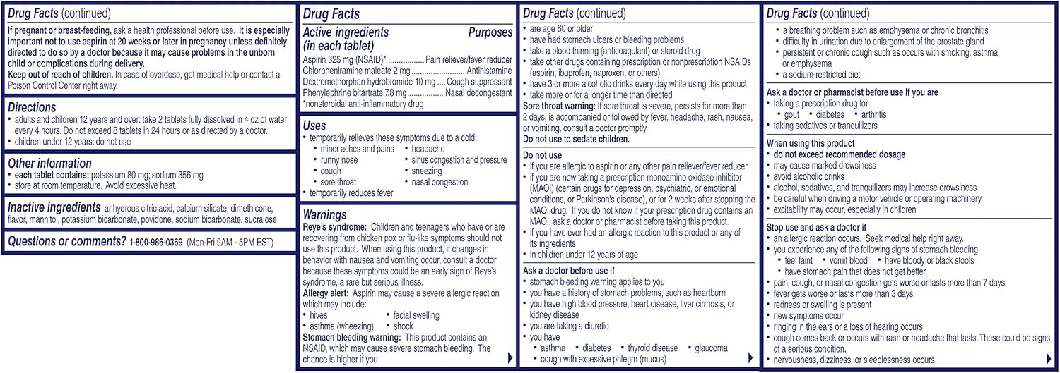 Colds try to ruin a good night’s rest, but thankfully, you can reach for Alka-Seltzer Plus Cold Night Effervescent Tablets with a refreshing lemon flavor to get effective relief from your worst cold symptoms: Nasal Congestion, Cough, Runny Nose, Sneezing, Headache & Body Ache, Sore Throat & Fever