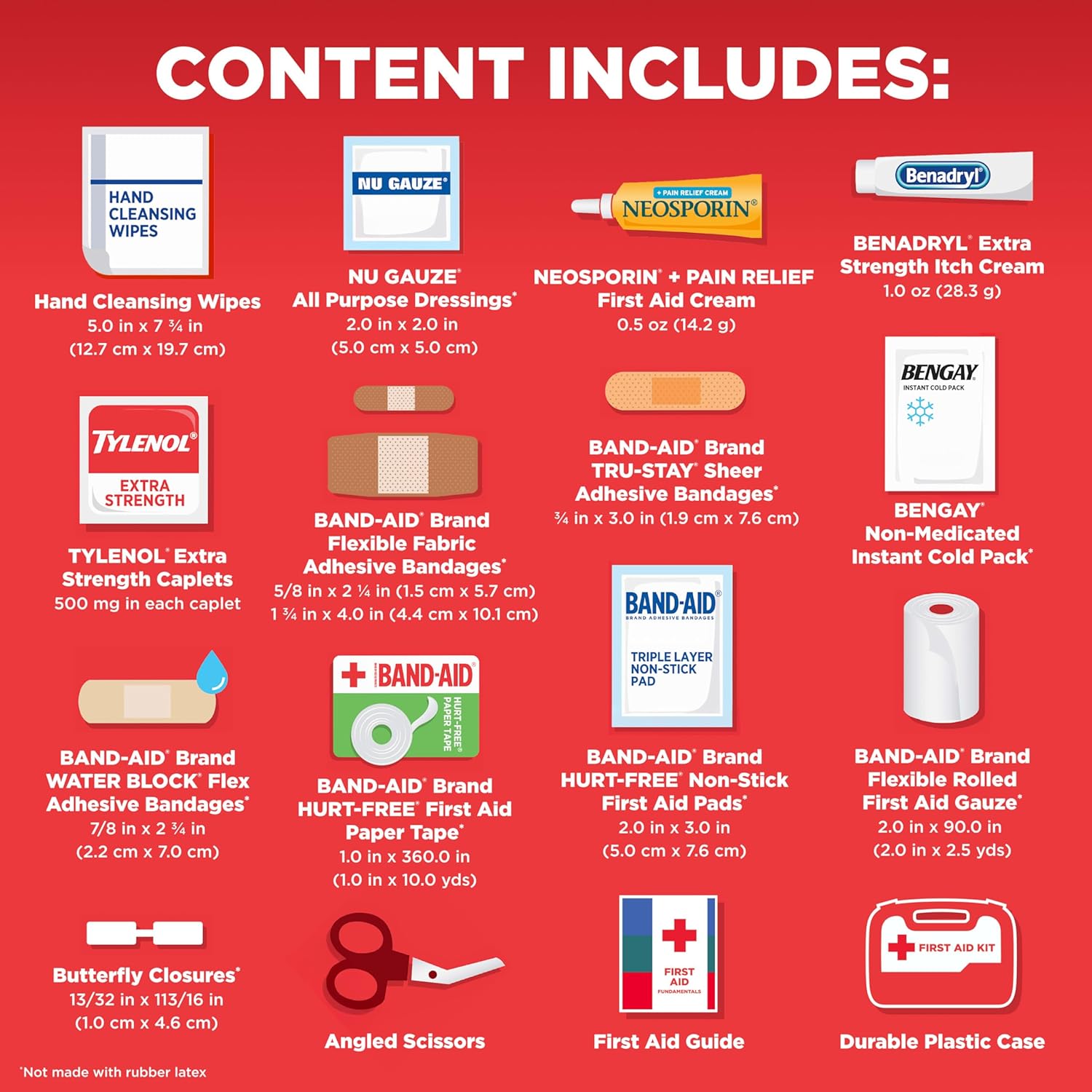 Care for minor cuts, scrapes & burns with the All Purpose Compact First Aid Kit. This emergency first aid kit contains essential first aid supplies including cleansing wipes, gauze pads, assorted bandages, rolled gauze, antibiotic cream, itch stopping cream, acetaminophen caplets, an instant ice pack, & more. This portable first aid kit contains products from leading, doctor-recommended brands, including BAND-AID Brand Adhesive Bandages, Neosporin, Tylenol, Bengay & Benadryl. The medical kit also includes a first aid guide & a durable, plastic box to keep items accessible & organized. Refill this first aid kit with your favorite first aid supplies to always be prepared for minor injuries. This #1 selling branded first aid kit is for use anywhere – perfect for use at home, in a dorm, in the car & on-the-go, or for camping & outdoor activities. All Purpose Compact First Aid Kit is HSA & FSA eligible. Check with your plan for complete coverage details.