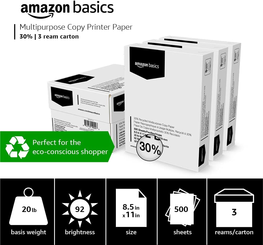 Amazon Basics 30% Recycled Copy Printer Paper, 8.5 x 11 Inch 20Lb Paper – 3 Ream Case (1,500 Sheets), 92 GE Bright White