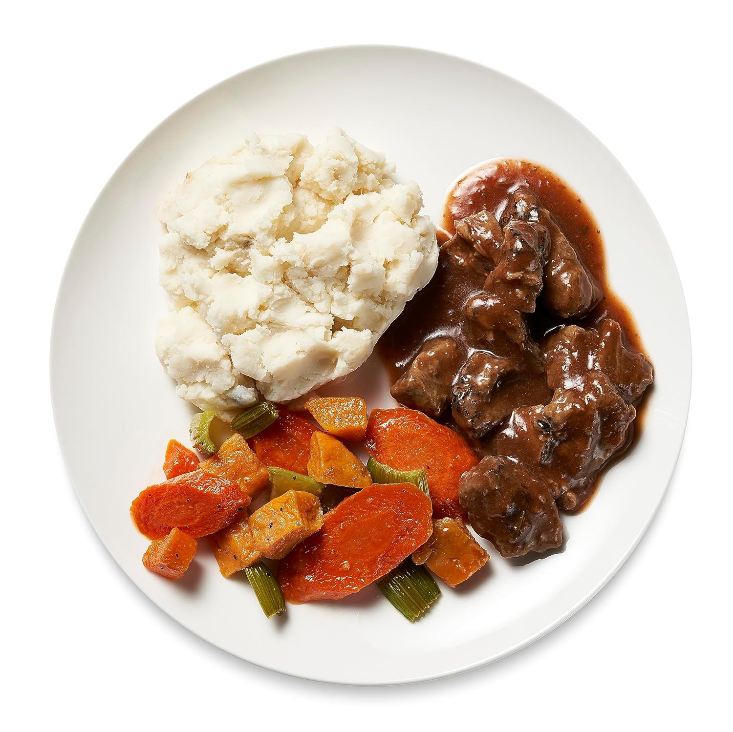 Slow-roasted beef and creamy mashed potatoes with gravy, carrots, sweet potatoes, celery and mushrooms