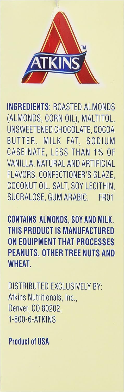 THE ATKINS MISSION. Atkins’ purpose is to improve global health and to help people understand that eating right is about both losing weight and becoming healthy. That’s done through the use of imagination, innovation, partnerships and commitment to science to make it easy to eat right. CHOCOLATE COVERED ALMONDS. Atkins’ treats help support your low carb lifestyle without compromising flavor. This treat delivers all the taste you crave with none of the guilt. So the next time you need some sweetness, reach for these crunchy, roasted almonds dipped in rich chocolate. WHAT’S INSIDE. Let this keto-friendly* treat delight your taste buds while keeping your lifestyle on track. Includes 4 packs, each with five 1 oz pouches with 3 grams of protein, 1 gram of fiber, 2 grams of net carbs and 1 gram of sugar per serving.*When used with Atkins ketogenic programs EAT RIGHT. NOT LESS. Cardiologist Dr. Robert C. Atkins saw that eating right, not less, improved his patients’ health – not just in terms of weight loss but also reducing chronic issues. Over the last 45 years, mounting evidence is revealing that Dr. Atkins was right. PUBLIC HEALTH ADVOCACY. The “Atkins Diet” started as a fad, but quickly became a counter-conventional movement that reset people’s understanding of nutrition and weight loss, and its link to health. Atkins public health advocacy has played a significant role in updating dietary guidelines, moving them from less and towards right.