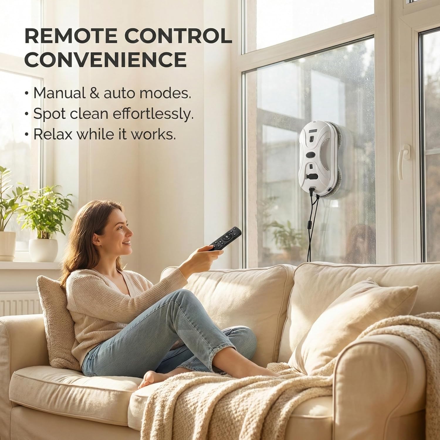Remote Control for Convenience: The automatic window cleaner is fully controllable via an infrared remote control, allowing you to activate three automatic cleaning modes and manual control for tailored cleaning sessions. The remote-controlled water spray system adapts to your needs by adjusting the spray for different cleaning scenarios. Whether you’re tackling a quick spot clean or a deep wash, the remote provides the flexibility to choose the most suitable mode for any job