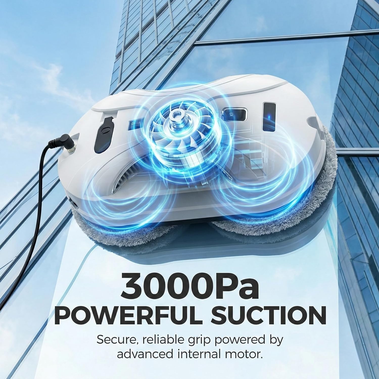 Triple Safety System for Secure Cleaning: The window robot is designed with advanced vacuum suction motor technology, offering a powerful 3000Pa suction force to securely attach to windows during operation. It also includes a UPS power storage system, which ensures the robot continues to operate for up to 30 minutes during unexpected power outages. The high-strength safety rope provides added protection, preventing any accidents or falls during cleaning