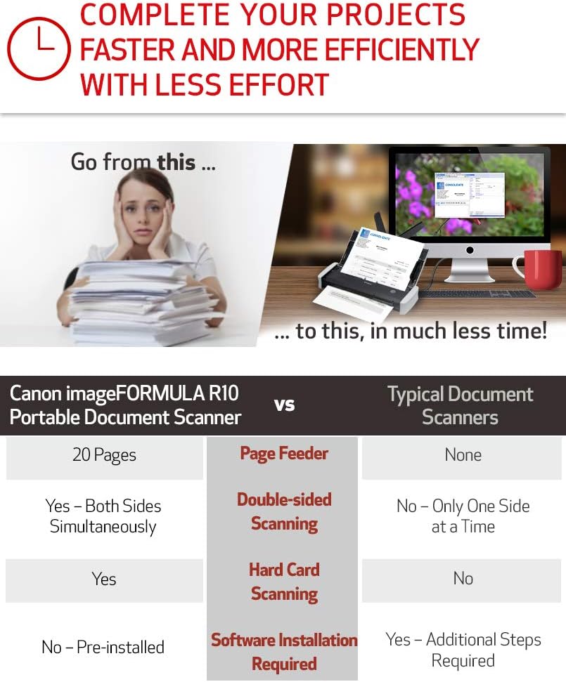 FAST AND EFFICIENT – No technical hurdles or complicated setups here; easily scan both sides of a document at the same time, in color or black-and-white, at up to 12 pages-per-minute, and with a 20 sheet automatic feeder