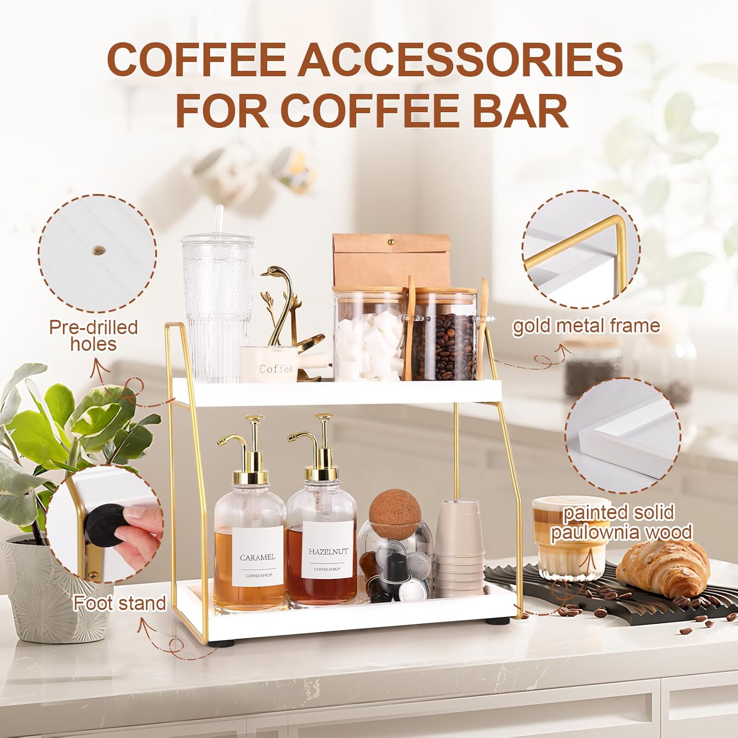 Stylish Design Kitchen Countertop Organizer:Coffee organizer station is made of high-quality painted solid paulownia wood with white storage trays on gold metal frame;2-tier shelf organizer fits any coffee bar decor,kitchen counter organizer needs