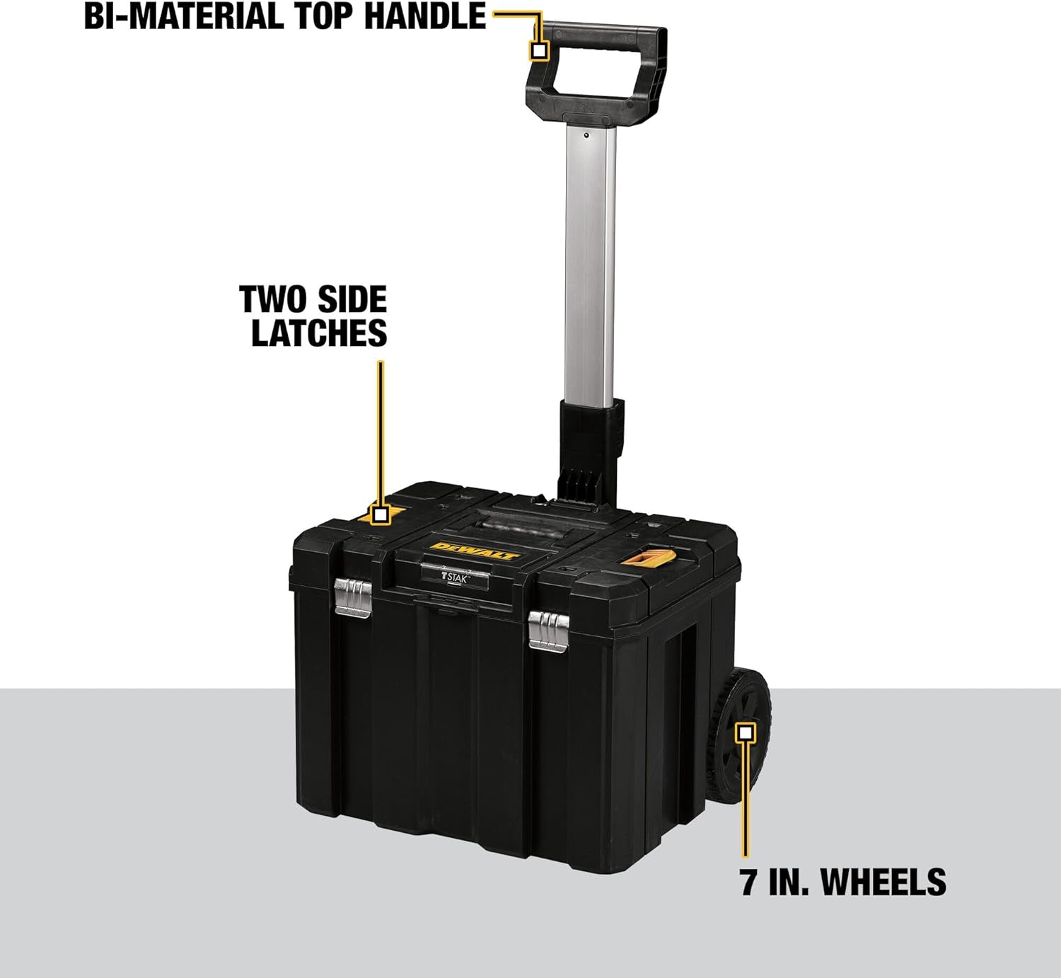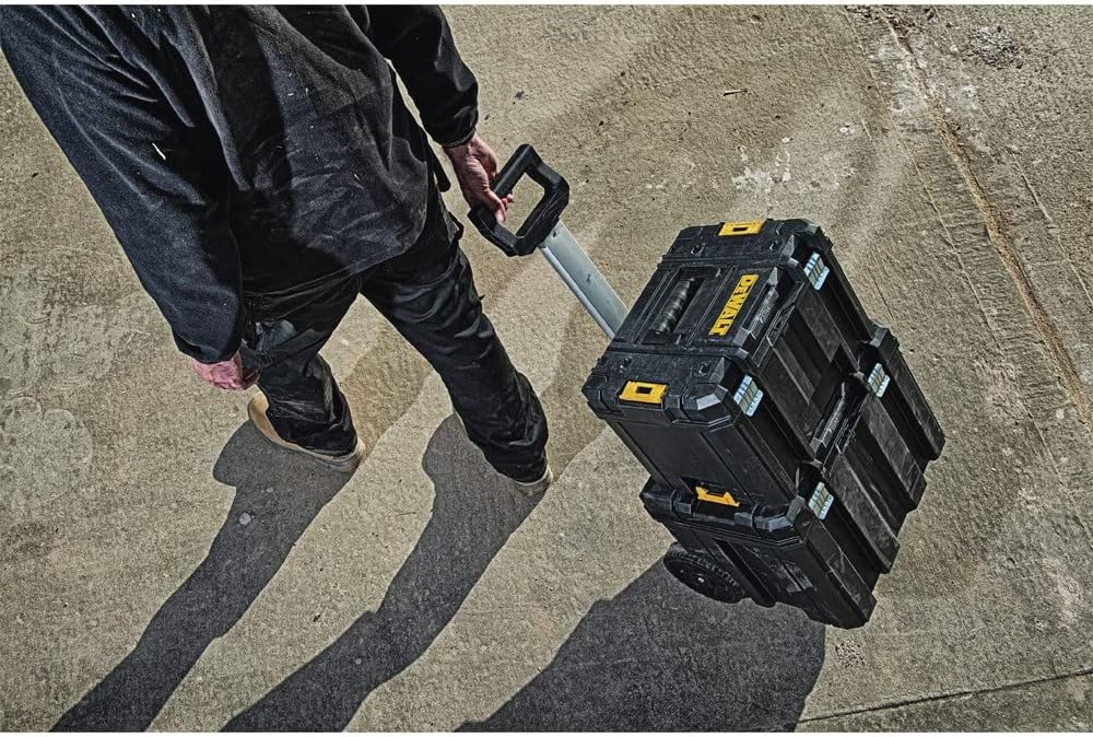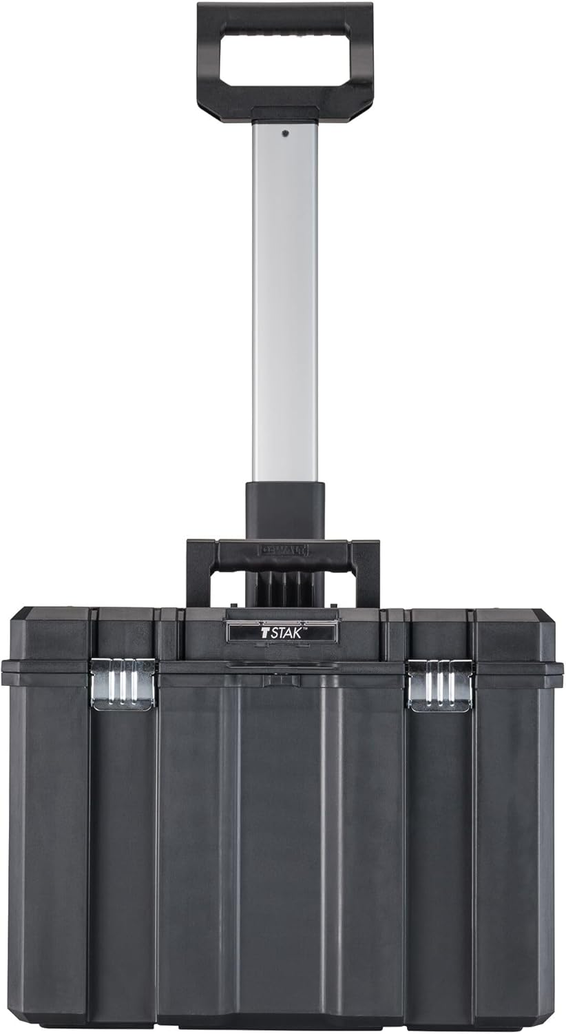 The DEWALT TSTAK Mobile Storage unit combines a large volume storage tool box with durable 7-inch wheels. With rust-resistant metal latches, bi-material top handle and side latches that allow stacking all other TSTAK units on top, this is a great maneuverability solution.