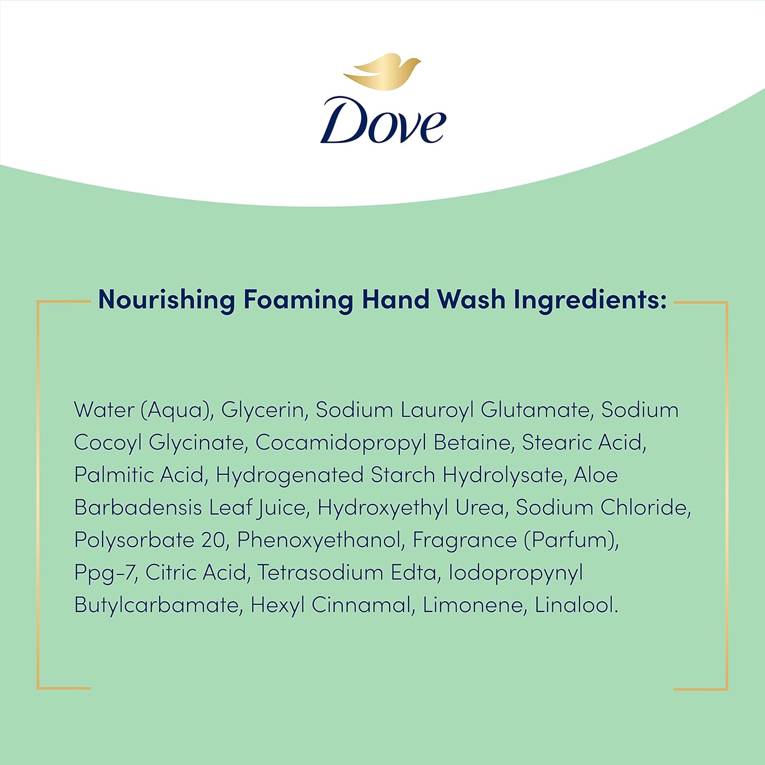 Nourish your skin and pamper yourself with Dove Aloe and Eucalyptus Nourishing Foaming Hand Wash. The indulgent foaming hand wash is formulated with our unique 5X Moisturizer Blend, consisting of five skin-natural nutrients and moisturizers. It effectively washes away dirt and germs, while nourishing hands for hours. This luxurious foaming hand wash gives your skin the indulgent care it deserves with the light, fresh scent of aloe vera. Dove Nourishing Foaming Hand Wash refill is specifically designed to work with our Touchless Foaming Hand Wash Dispenser, a water-resistant and touch-free device that makes your hand washing experience simple and easy. Perfect for any sink, it instantly dispenses our Aloe & Eucalyptus moisturizing hand wash without the mess. Simply let the rich foam automatically dispense into your hand for a refreshing hand wash experience. This gentle foaming hand wash is sulfate-free and paraben-free. Plus, globally, Dove does not test on animals and is certified by PETA.