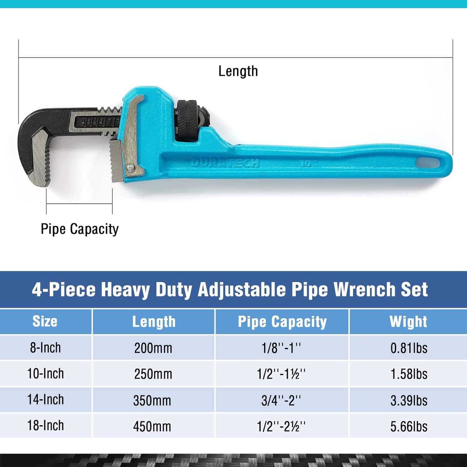 Heavy-duty pipe wrench with sturdy cast-iron body protects the tool from damage in harsh conditions. Design particularly suitable for working in confined or restricted areas and at the most difficult angles. Sizes include 8 inch, 10 inch, 14 inch, and 18 inch