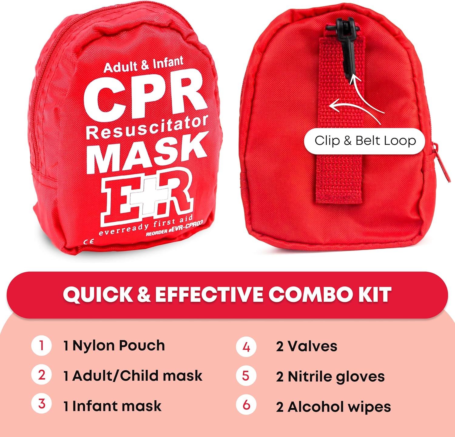 QUICK & EFFECTIVE COMBO KIT- This all-in-one kit includes everything you need to safely perform CPR in any situation. The kit includes an Adult and Infant CPR mask, 2 Valves, A pair of vinyl gloves, and 2 alcohol prep pads.