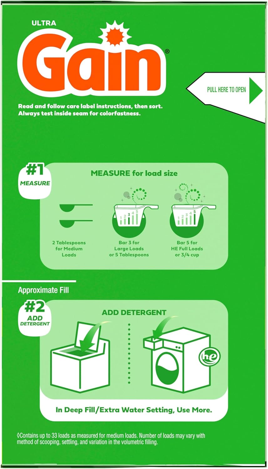 For long-lasting freshness and brightness, try Gain Original HE Powder Laundry Detergent. This powerful laundry detergent is infused with AromaBoost technology, ensuring that your clothes not only get clean but also smell amazing for weeks. Gain Powder is specially formulated to tackle tough stains while providing a delightful scent that lingers long after washing. Safe for both regular and high-efficiency machines, Gain Original Powder Detergent is easy to use. Simply add the recommended amount of Gain Powder Detergent to the drum, toss in your laundry, and start your wash cycle. Experience the joy of fresh, clean clothes with the signature Gain scent that you love. For an even more intense fragrance, consider pairing it with Gain Fireworks Scent Beads and Gain Fabric Softener. With Gain, your laundry will not only look clean but also smell fantastic.