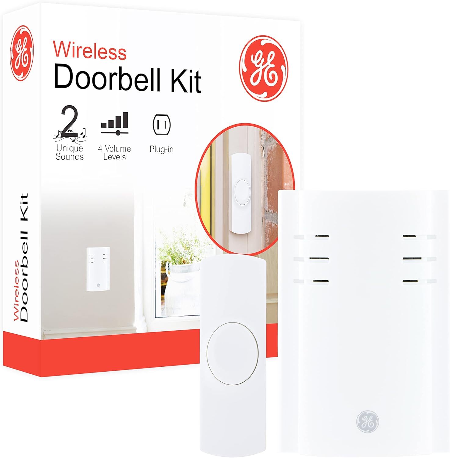 Always know when your guests arrive with the GE-branded 2-Melody Wireless Doorbell Kit. One plug-in receiver with a 150ft. range and one push button with mounting hardware are included in the kit. The plug-in door chime receiver pairs with up to four wireless push buttons and features two melodies — ding-dong and Westminster — to customize multiple entryways with separate sounds. For additional personalization, adjust the sound level using four volume settings. The push button includes a CR2032 battery for easy installation and comes already paired with the receiver. Mounting instructions are included for the push button while the receiver simply plugs into any indoor outlet. Installation is a breeze thanks to wireless setup, provided mounting hardware and up to a 150ft. range. By not requiring wiring, the kit is ideal for apartments, dorm rooms, rentals, RVs and other temporary living spaces. The white finish allows the doorbell and button to integrate into any décor. Give your visitors a warm welcome with a GE-branded 2-Melody Wireless Doorbell Kit.