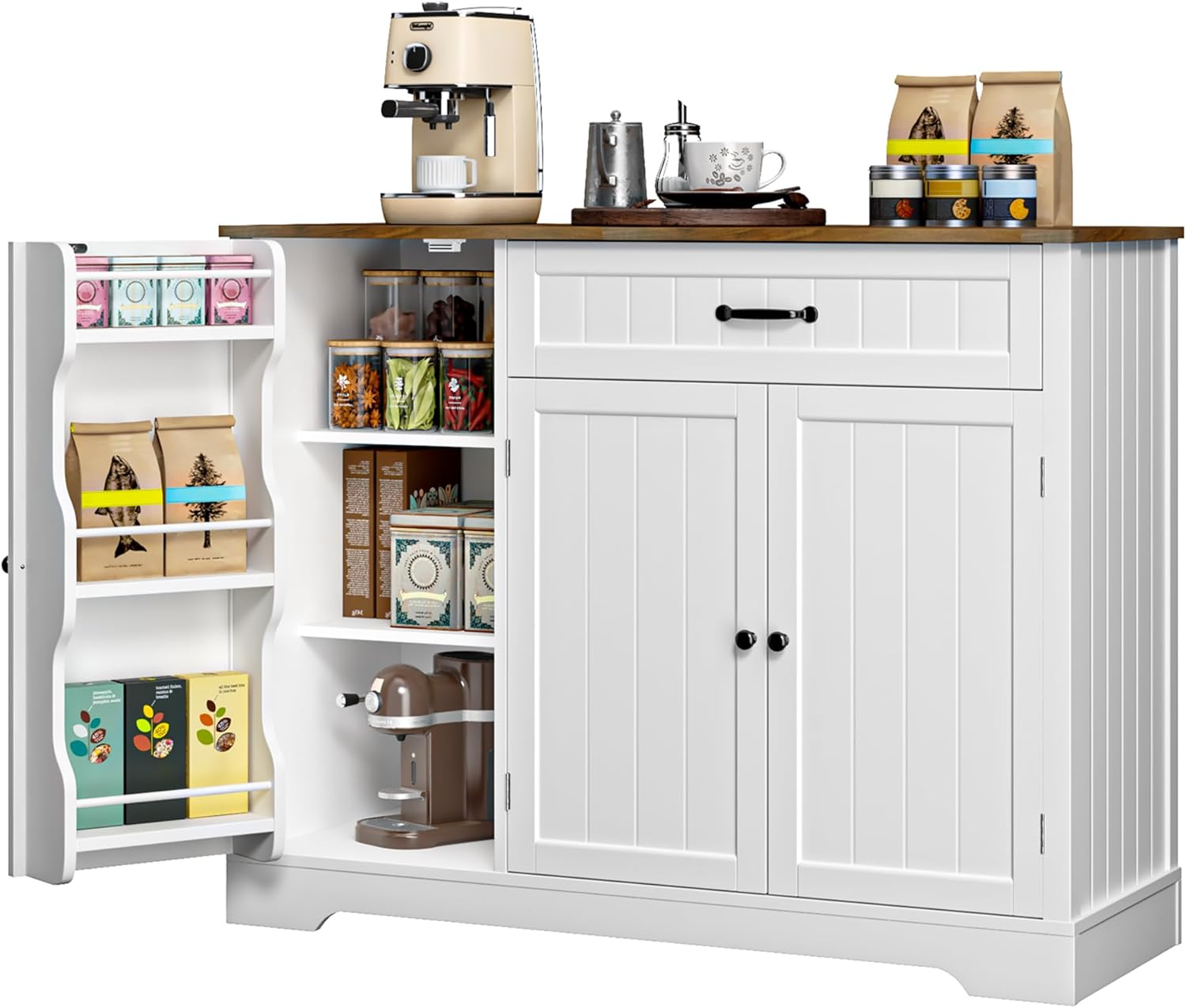Gizoon Kitchen Coffee Bar Cabinet with Storage Kitchen Sideboard Buffet Cabinet with Drawers, Short Pantry with Door and Shelves for Bathroom and Living Room, White and Rustic