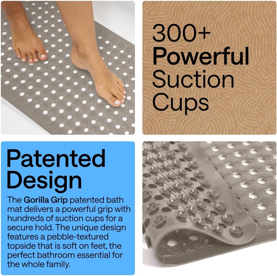 PATENTED DESIGN WITH POWERFUL SUCTION GRIP: a bath mat designed to securely stay in place; this patented bathtub mat features hundreds of suction cups that effectively help secure the tub mat to your shower floor