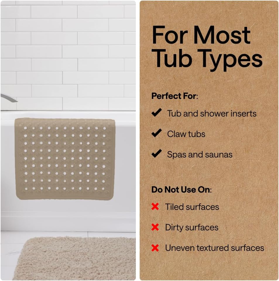 FOR ALL TUBS: this bath tub mat fits all kinds of tubs and inserts; only install on smooth, clean, non-textured, and non-tiled surfaces; not for use on newly refinished tubs, shower pans, or similar surfaces