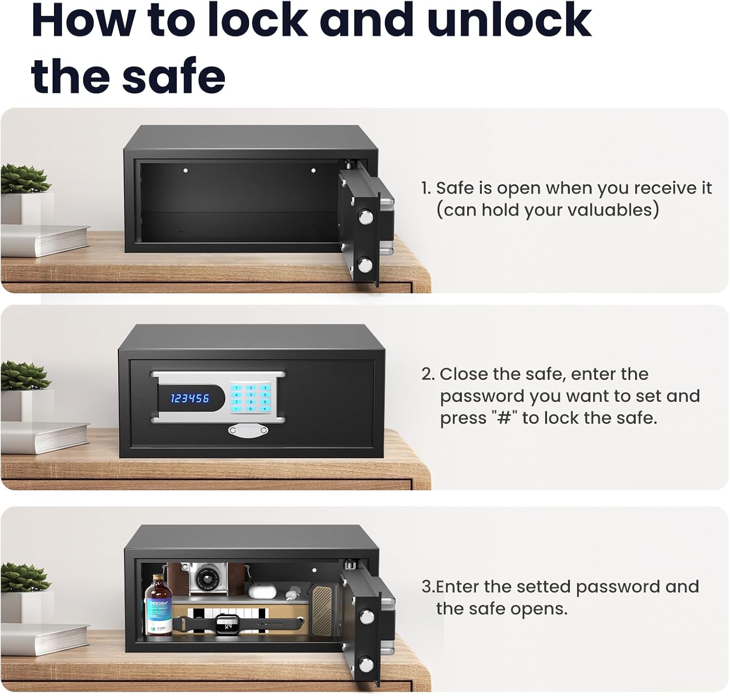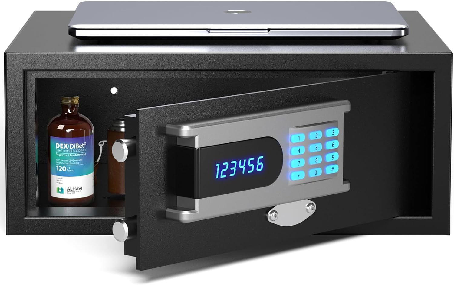 The LCD will display the numbers you input, and you can manually turn it off. The backlit keyboard allows you to set a password with 597K possible combinations, ensuring easy access to the safe even in the dark