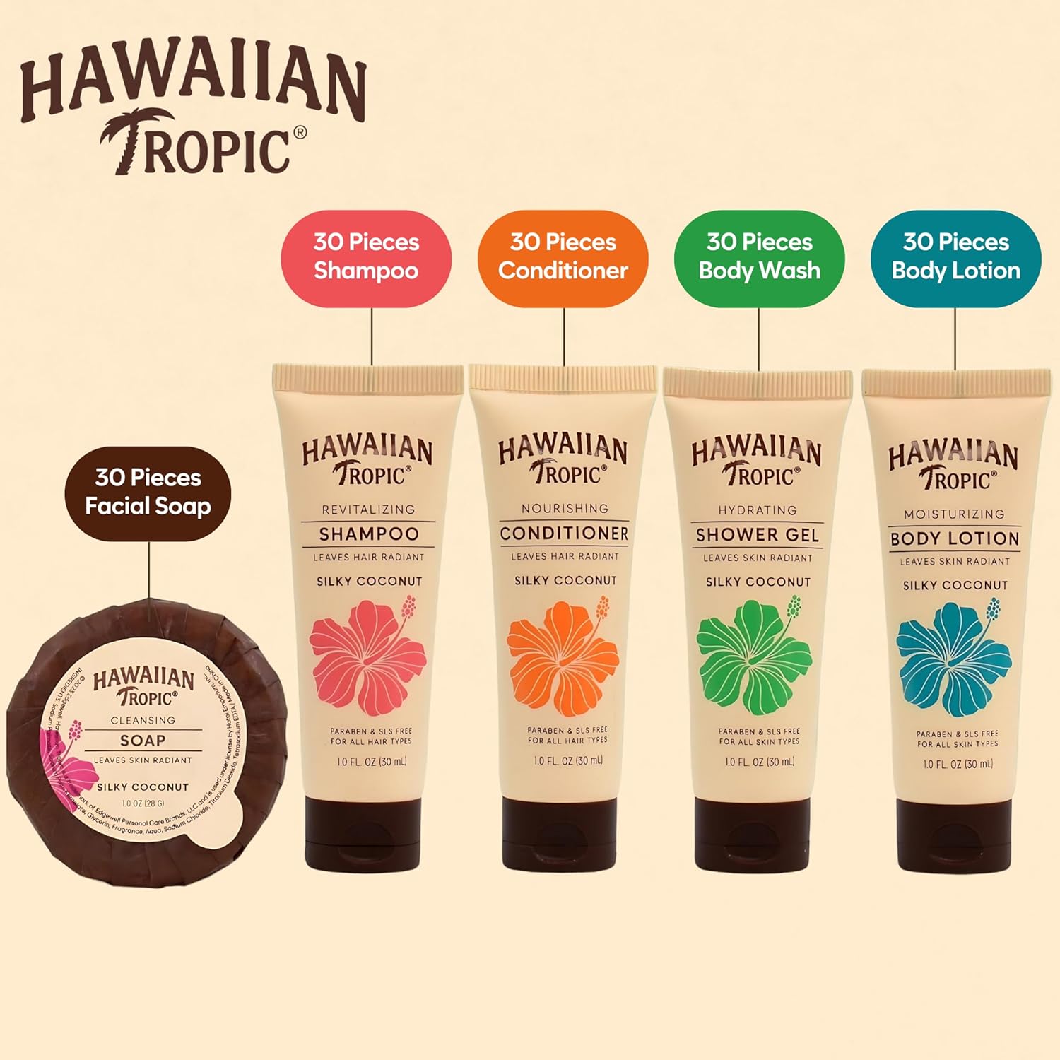 COMPLETE SET: The Hawaiian Tropic Full Set includes 150 items: 30ml Body Lotion Tubes (x30), Body Wash Tubes (x30), Conditioner Tubes (x30), Shampoo Tubes (x30), and 28g portable soap bars (x30). Packaged neatly for easy organization and distribution, making it an ideal hotel amenities or skin care set.