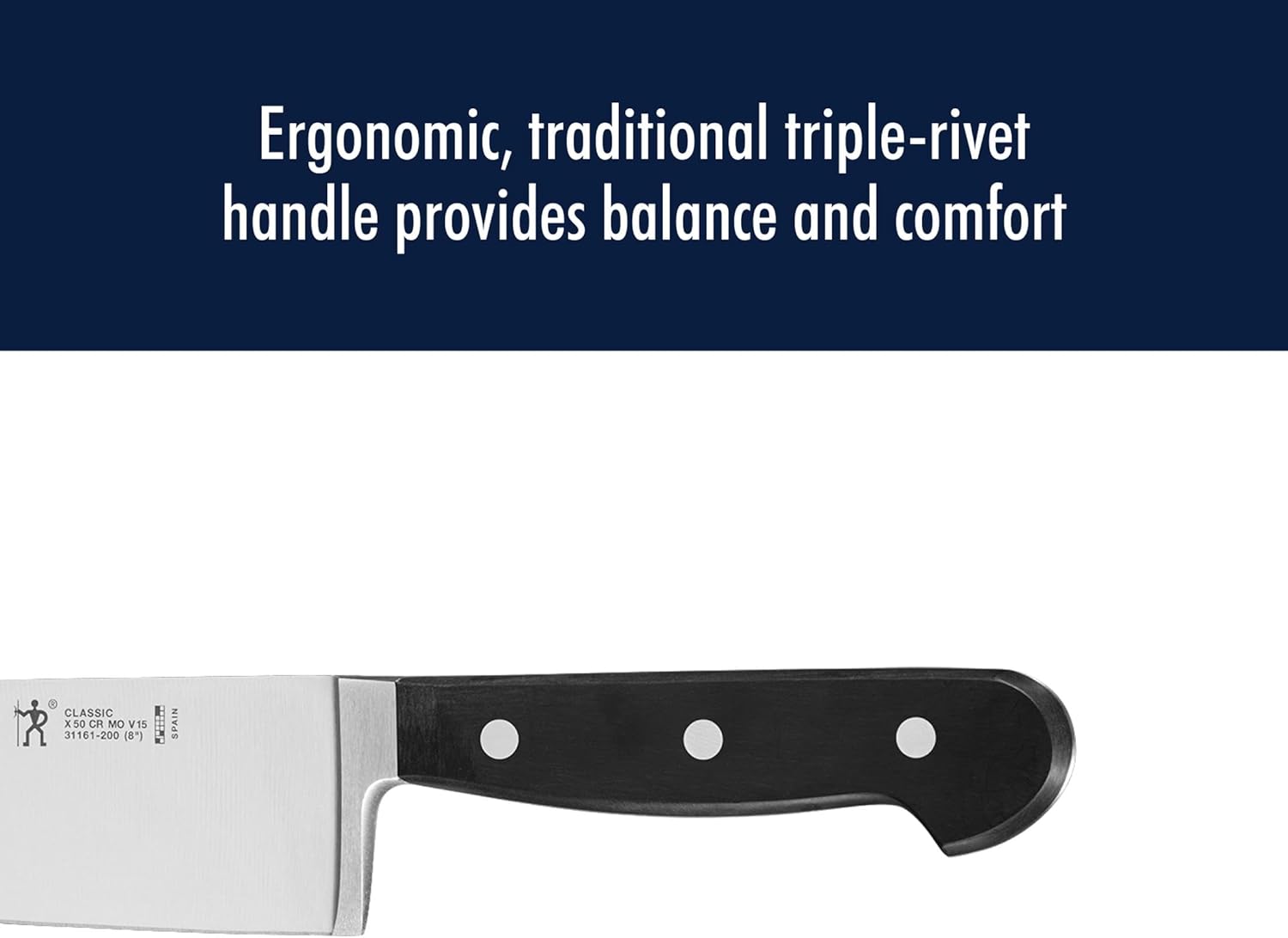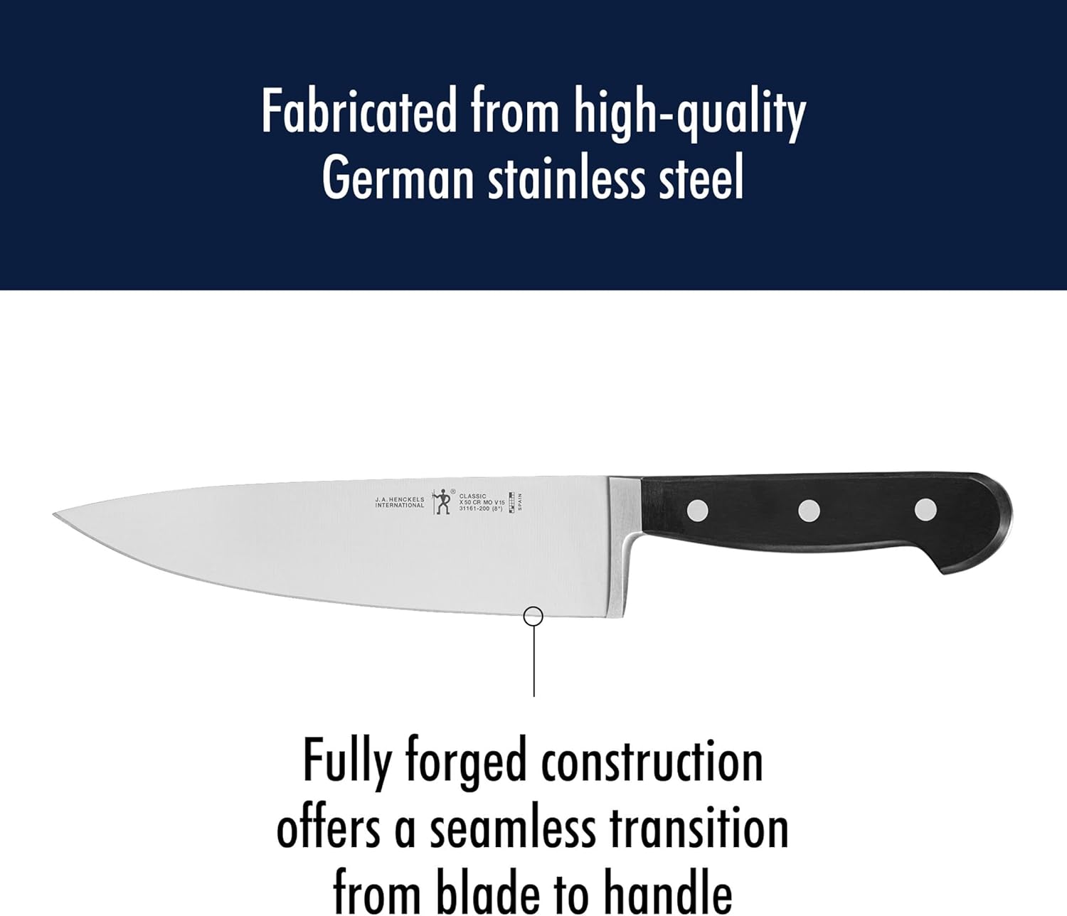PRODUCT DESCRIPTION Experience confidence with each cut. The Henckels CLASSIC 8″ Chef’s Knife boasts a precision, fine-edge blade that is honed for long-lasting sharpness. Chop potatoes, dice apples, mince shallots and slice salmon effortlessly – this kitchen workhorse is up for almost any task.High-quality German stainless steel strengthens this durable, Spanish-made knife. With a seamless transition from blade to handle, the knife’s fully forged construction provides balance as the traditional triple-rivet handle encourages tireless cutting.Henckels makes essential kitchen tools every home chef needs. From steak knives to spatulas, every product boasts high quality at an exceptional value. Created in 1895 by Zwilling J.A. Henckels, this value-driven brand guarantees the same durability, design and ease of use for which the global company is known. Equip your kitchen with expertise with Henckels. AMAZON.COM A good chef’s knife becomes your daily kitchen companion. It’s used for everything from prepping steaks for the grill to finely mincing onions, and chances are you’ll reach for it every time you cook–so it better be good. This lower-priced line from Henckels is a great value: excellent quality knives with their standard lifetime warranty. There’s good balance, and the handles are a shade heavier than other lines, which some cooks will prefer. The 8-inch blade length is the most practical for multipurpose use, and regular sharpening will keep the stainless-steel blade razor-sharp. It’s only minimally flexible, which makes it a great choice for vegetables such as potatoes and turnips. While it’s dishwasher-safe, unless it needs sanitizing after use with raw meat, it’s often easier to hand wash. –Jill Lightner