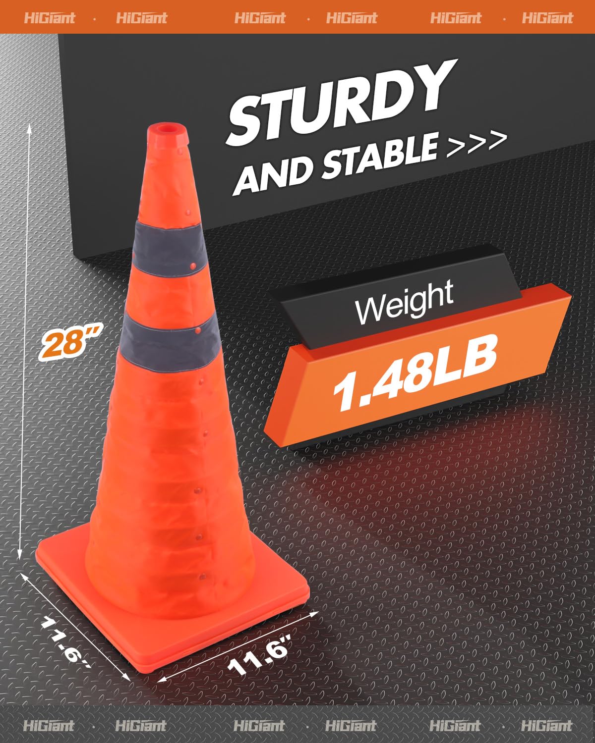 FOLDABLE DESIGN: The 28 inches orange cone is collapsible, can be pulled out to 28 inches, and easily folded down to 1.7 inches high. They store easily in your car or garage and take up very little space
