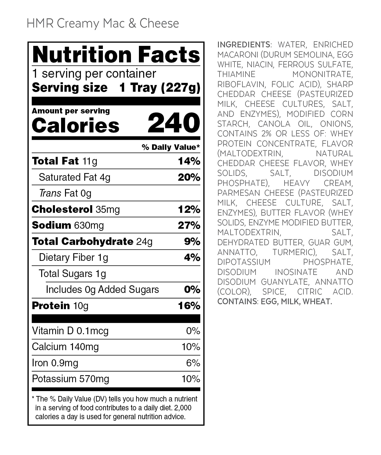 DELICIOUS & SATISFYING Weight loss never tasted so good! HMR’s creamy mac and cheese entrée fulfills your desire for comfort food. Tender elbow macaroni is smothered in rich cheddar cheese sauce. With only 240 calories, you won’t need to sacrifice a mouthwatering meal for a low-cal alternative.