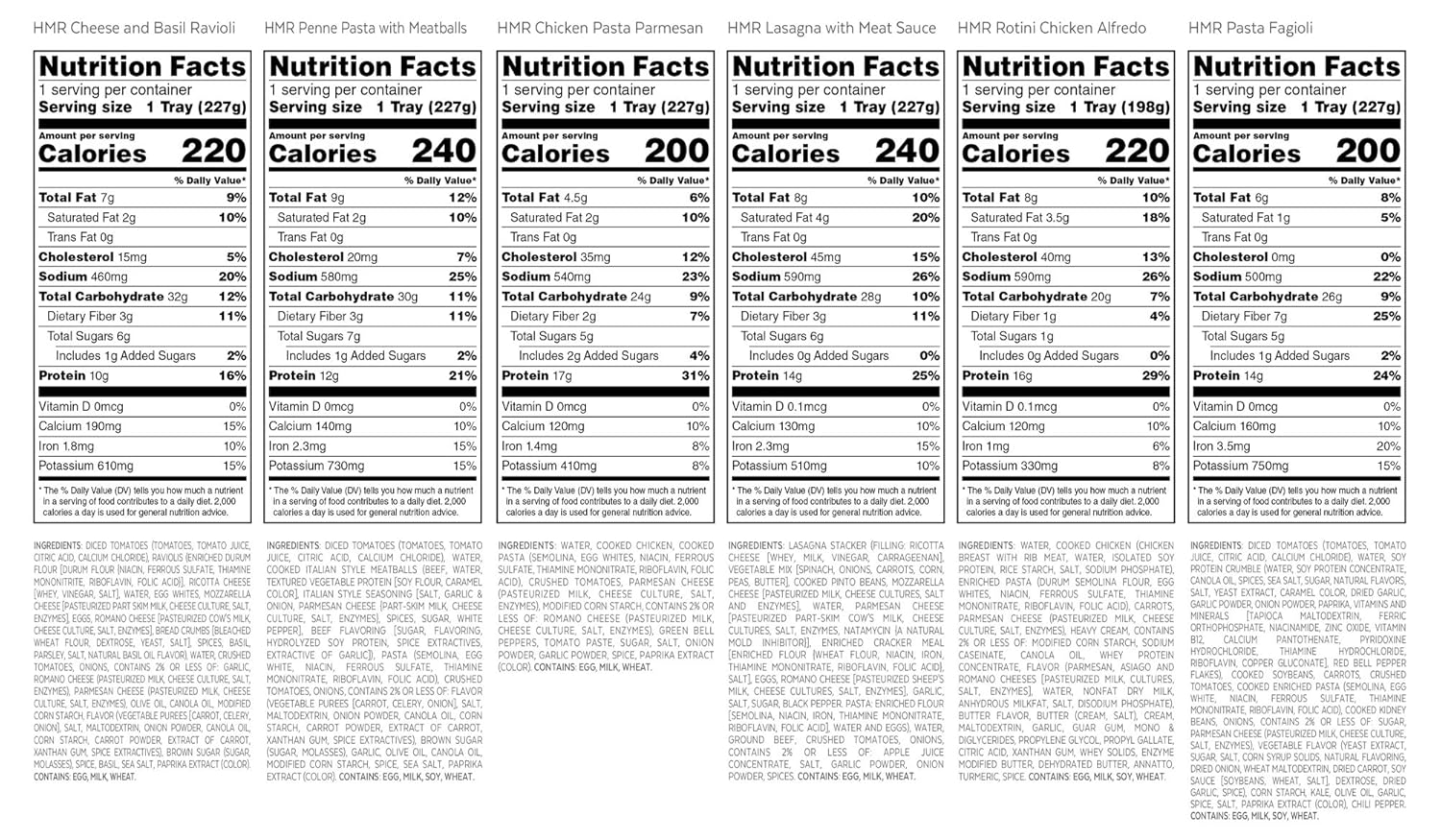 CLASSIC ITALIAN FLAVORS feature lower-calorie versions of favorite restaurant dishes, HMR Pasta Classics Entree Bundle includes one each of Penne Pasta with Meatballs in Sauce, 1 ea. Rotini Chicken Alfredo, 2 ea Cheese and Basil Ravioli w/Tomato Sauce, and 2 ea Creamy Mac & Cheese, each 200-240 calories, with 10g-17g protein.