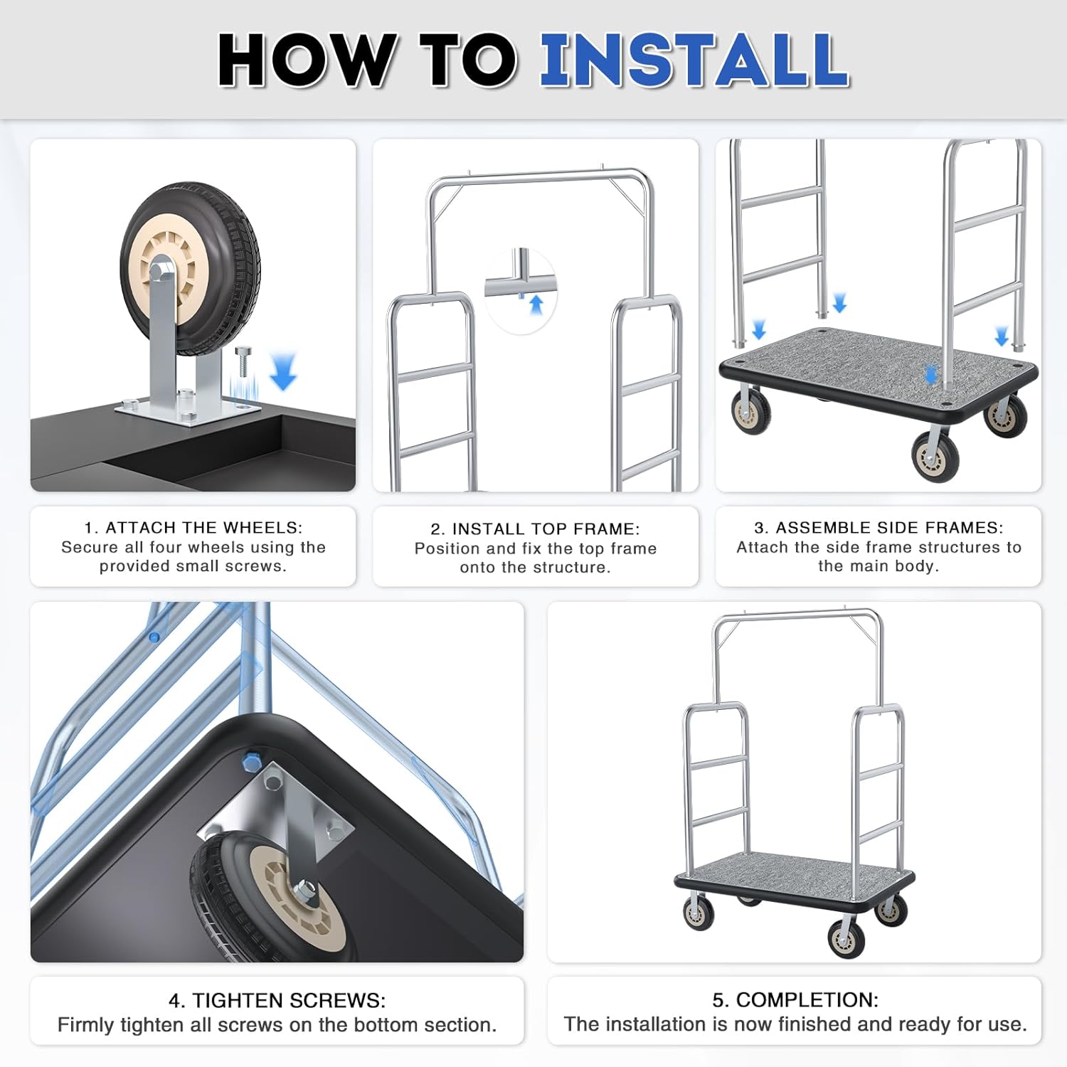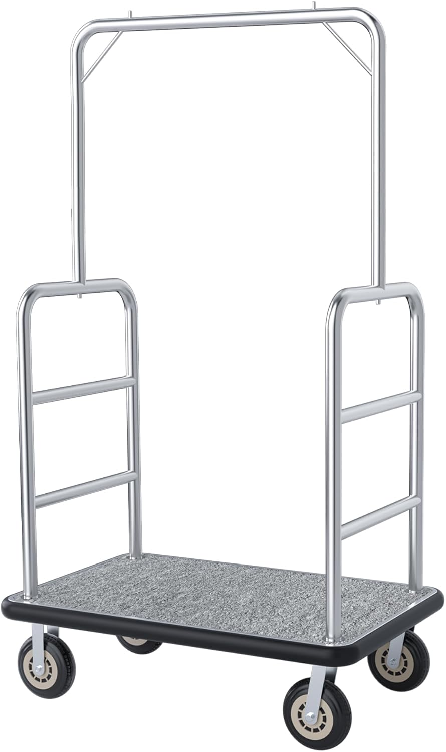 【Grey Carpeted Deck for Luggage Protection】The cart’s deck is covered with durable grey carpet that shields luggage (especially leather, hard-shell, or delicate bags) from scratches and scuffs during transport. The carpet is also easy to spot-clean—simply wipe away dirt or spills to keep the cart looking professional and well-maintained.