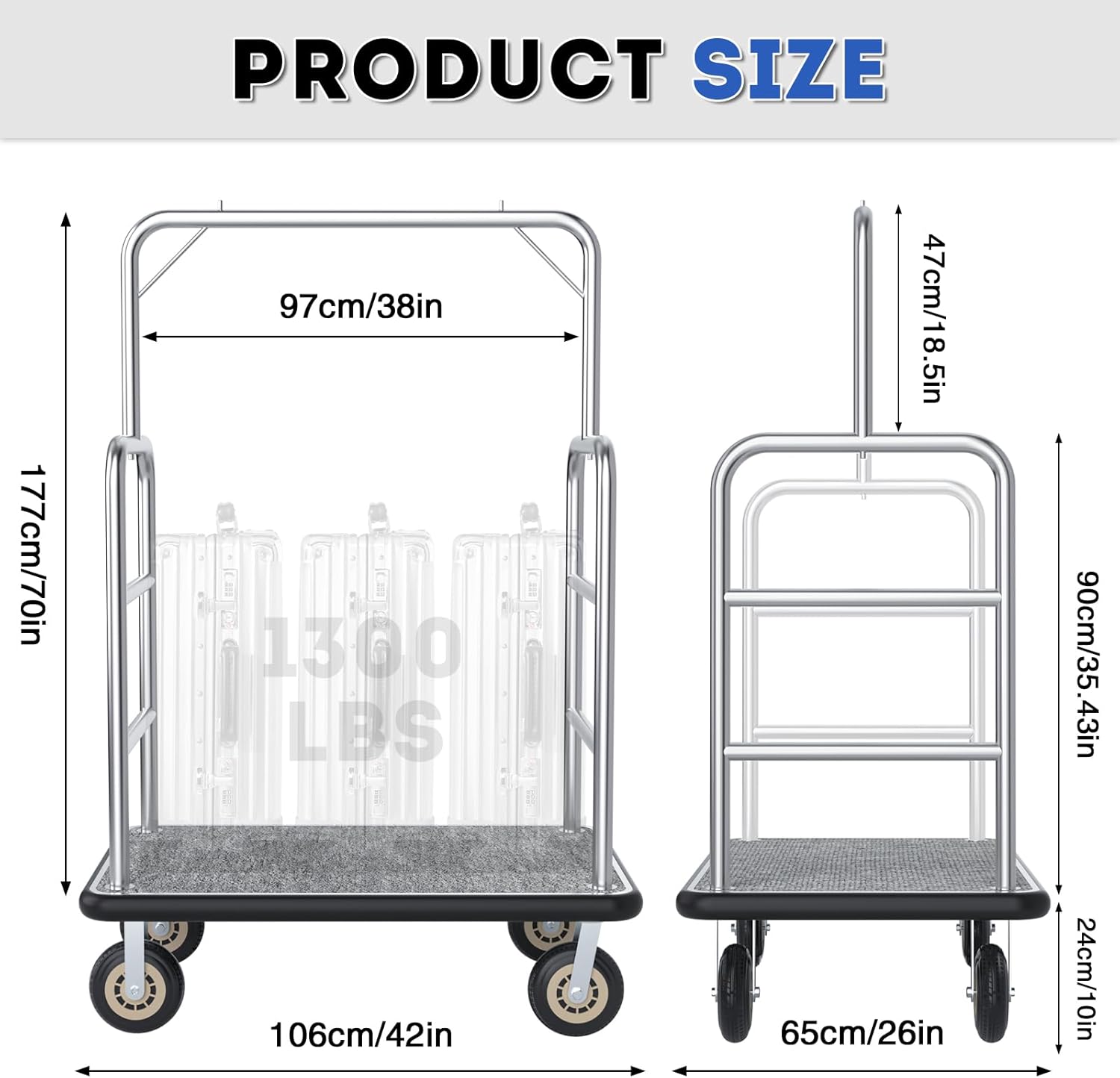【Two Practical Models for Diverse Needs】Our luggage cart choose from two tailored options: the standard model with a 900 LBS load capacity, perfect for daily luggage transport in hotels/condos; or the upgraded version featuring built-in garment racks, boasting an enhanced 1300 LBS capacity to carry both luggage and hanging items (like suits, dresses) at once. Ideal for resorts or busy bellman services needing extra versatility.