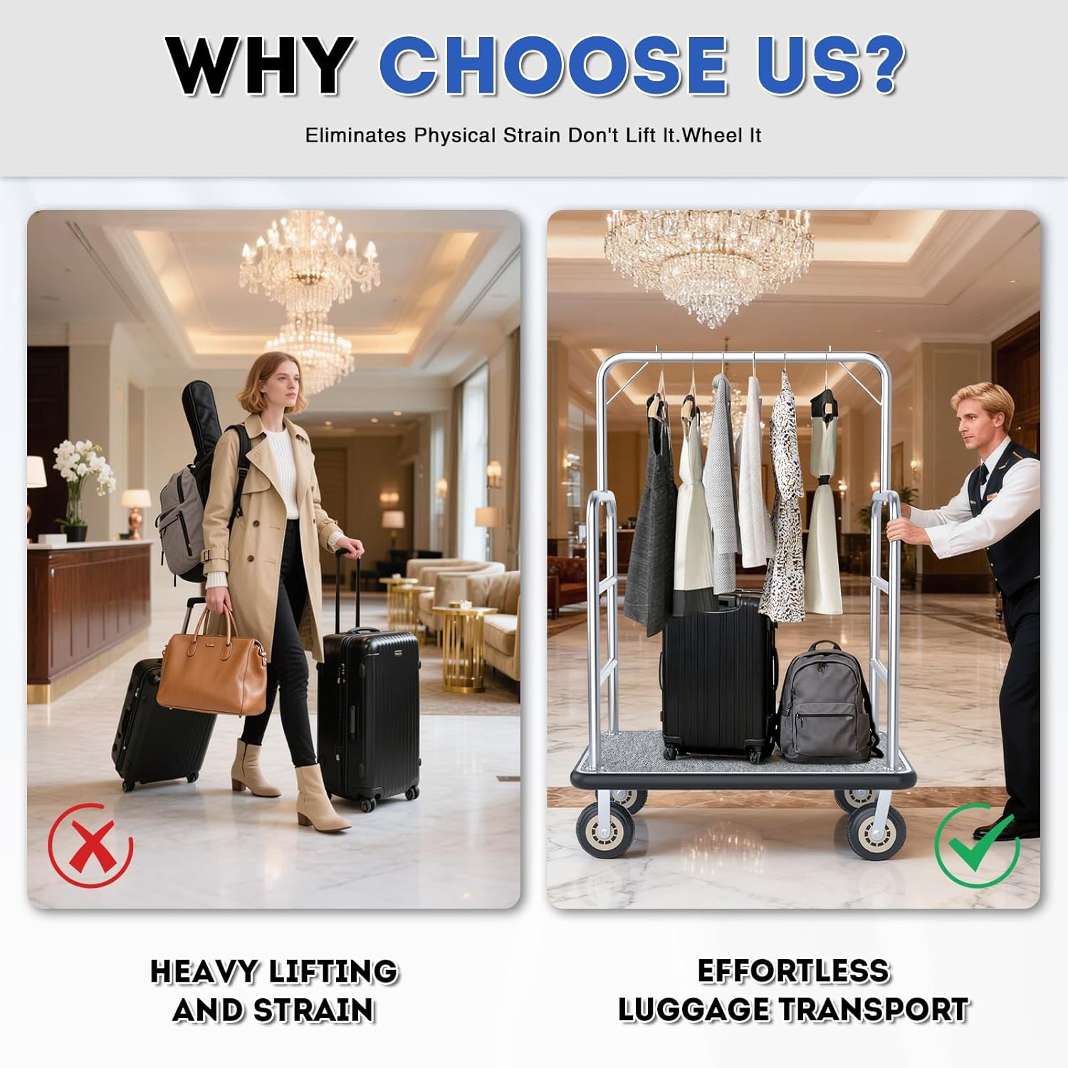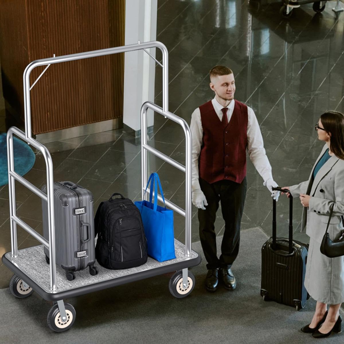 【Ideal for Hospitality & Commercial Spaces】Tailored for hotels, condos, resorts, and even luxury apartments, this bellman’s cart blends functionality with a sleek, modern look that complements upscale interiors. It streamlines luggage transport for guests, reduces staff workload, and enhances the overall guest experience with its reliable, user-friendly design.