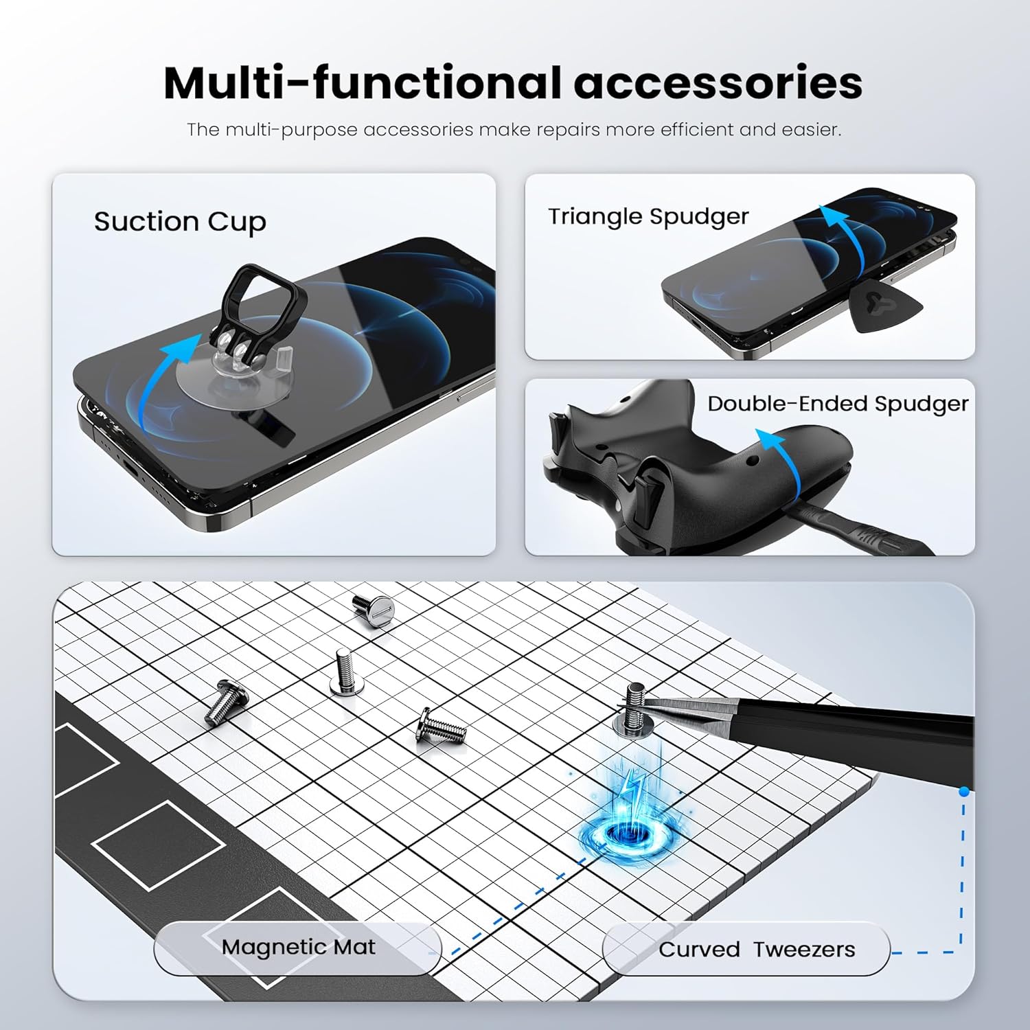 【Multifunctional Accessories】 This set contains 12 accessories to meet various repair needs. The matching flexible shaft facilitates multi-angle disassembly and repair of electronic products. The magnetizer demagnetizer tool can increase or decrease the magnetism of the bit. The magnetic mat is used to absorb small screws to avoid loss. The 1/4‘’ to 4mm silver adapter provided is used for electric screwdrivers to adapt large and thick bits, which is not suitable for precision and small manual screwdriver bits. This toolkit also comes with a double-ended pry bar, triangular pick and suction cup for easy repairing.