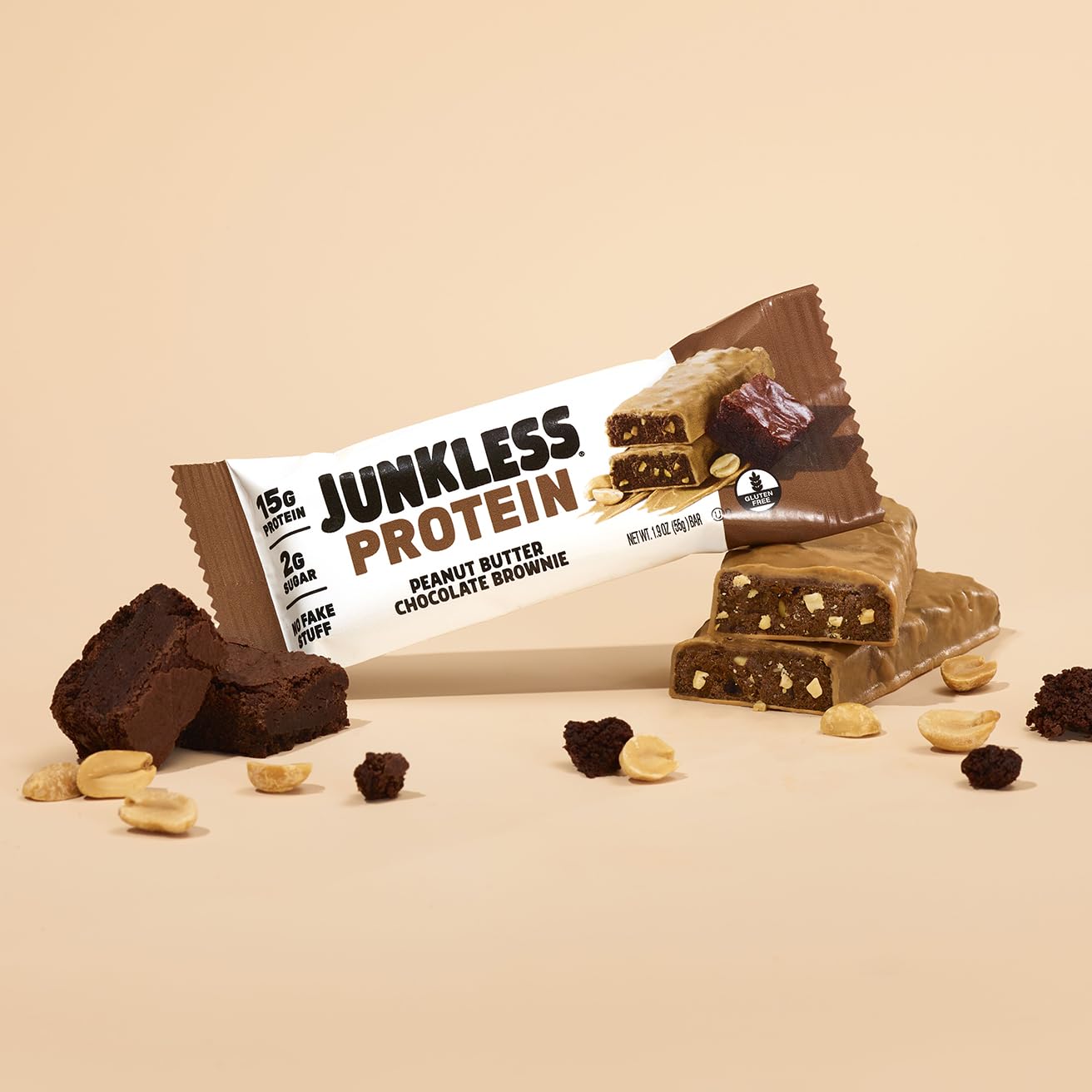 JUNKLESS Protein Bars – 15g Protein, No Added Sugar, Gluten Free, High Fiber, Delicious Taste and Texture, Satisfying, Healthy Snack for Energy – 12 Bars (Peanut Butter Chocolate Brownie)