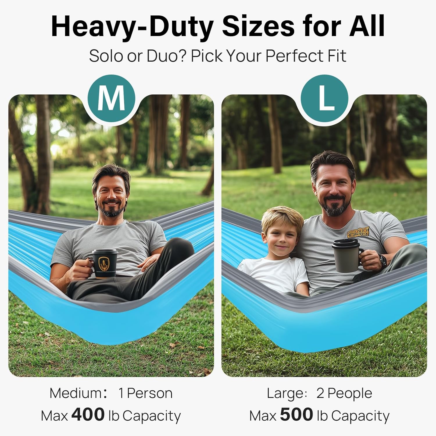 500 lbs Capacity for Double Hammock: The double hammock has an unfolded size of 120”L X 78”W and can support up to 500 lbs, making it perfect for accommodating two adults or anyone wanting some extra space. It is an ideal camping accessory for outdoor enthusiasts who enjoy hiking, camping, traveling, exploring, and other outdoor activities. They also make perfect camping gifts for anyone who loves the outdoors.