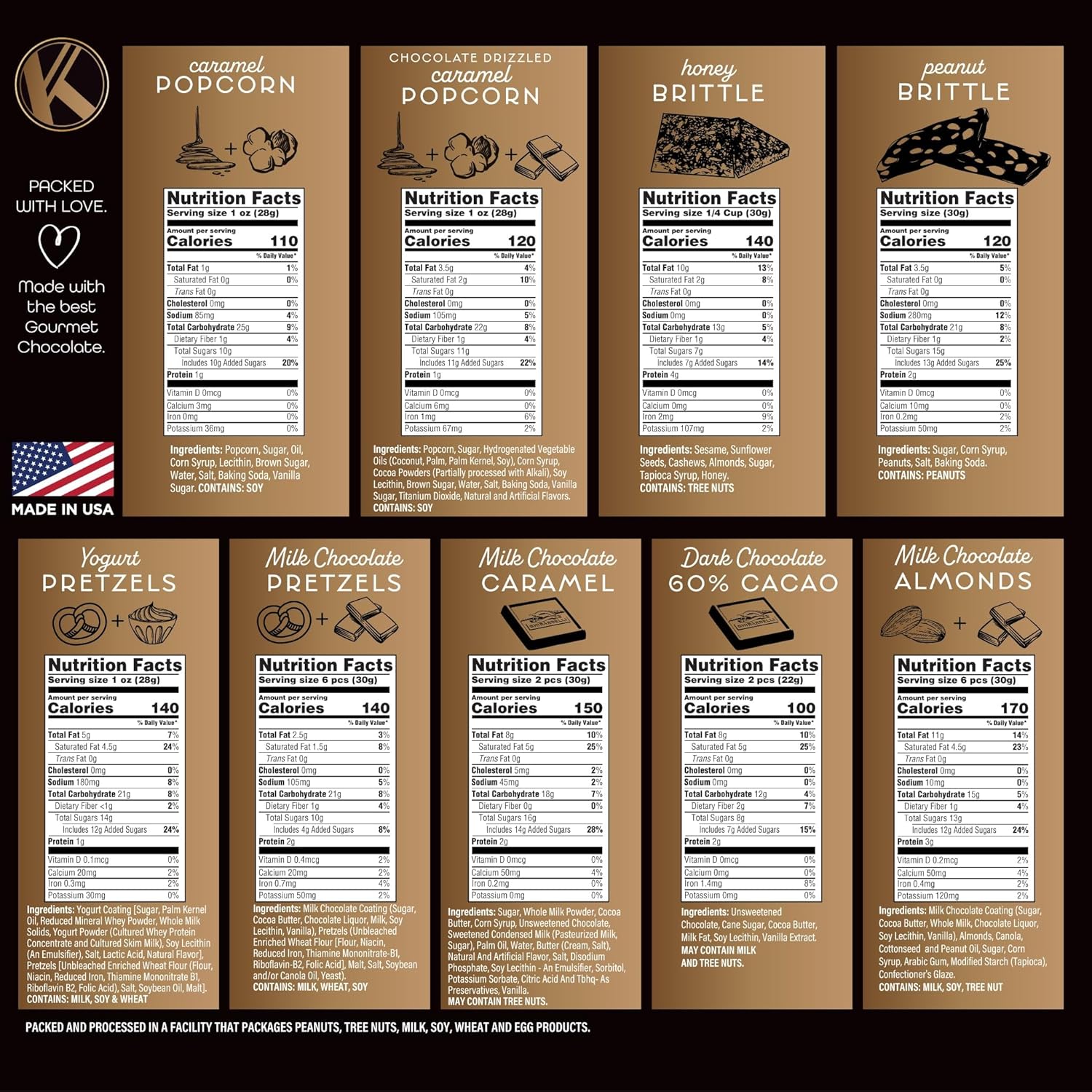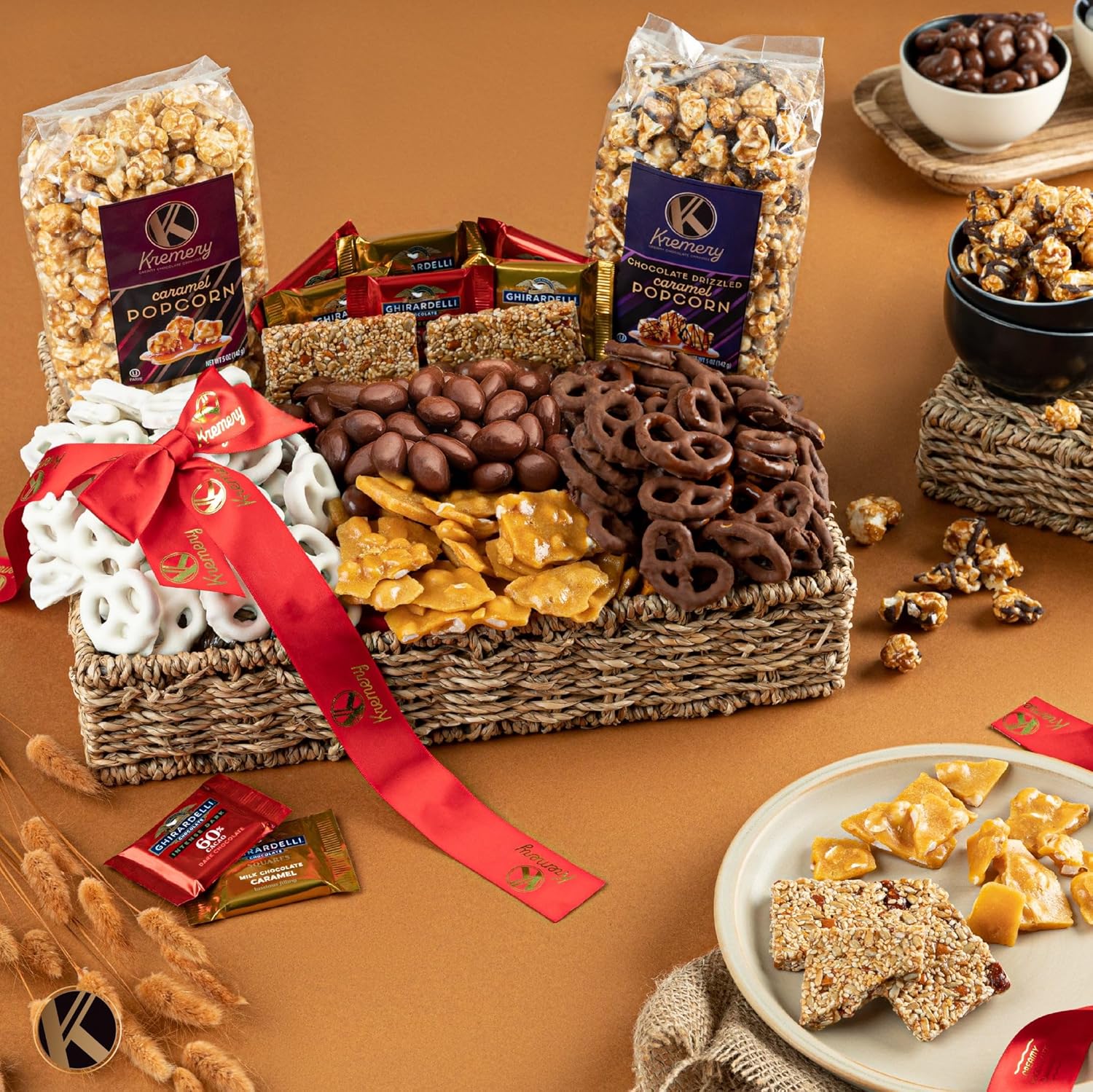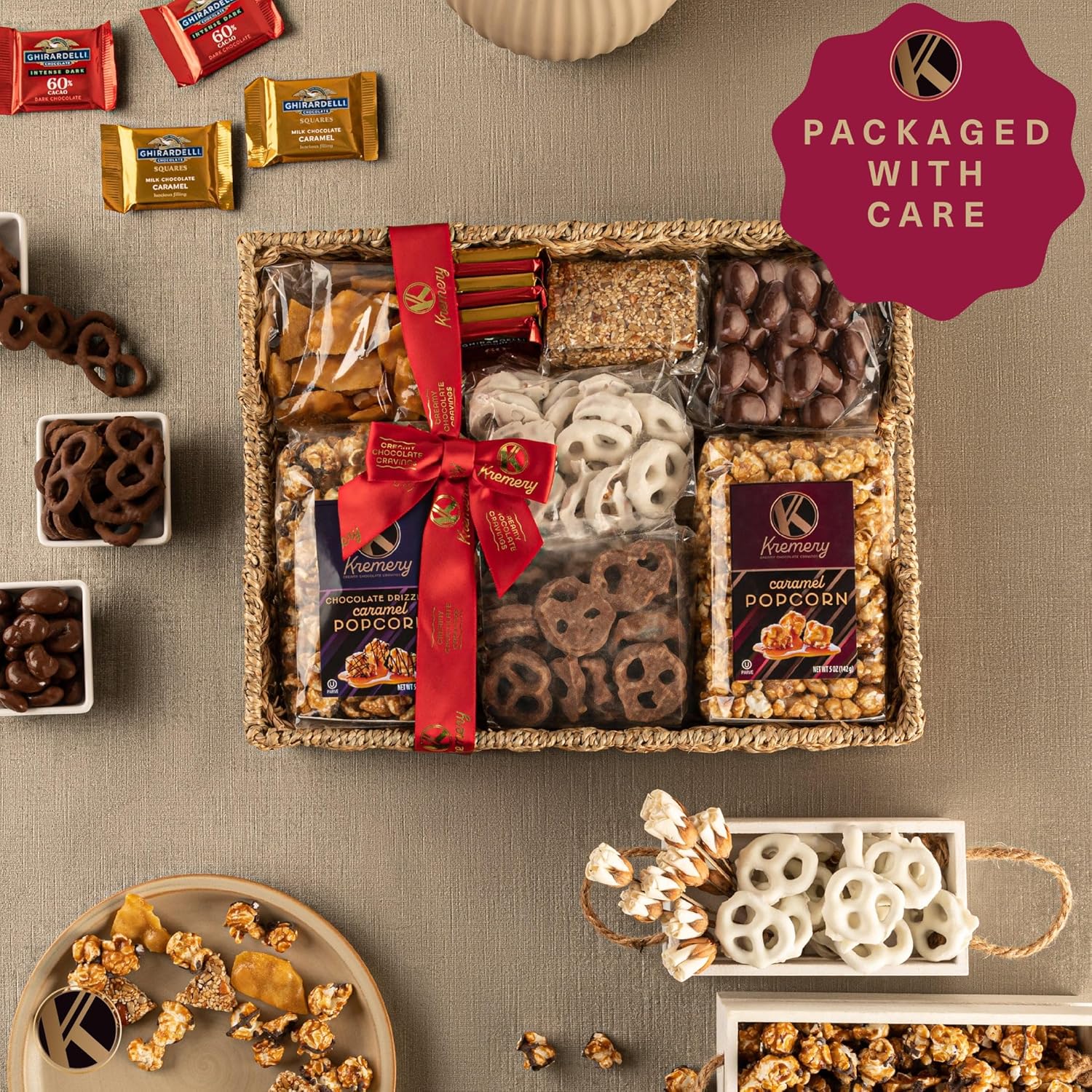 HANDPICKED SELECTION OF 9 TYPES OF TREATS: A carefully curated selection of sweet delicacies nestled within the basket: Drizzle Caramel Popcorn, Caramel Popcorn, Yogurt Pretzels, Covered Pretzels, Covered Cashews, Peanut Brittle, Honey Crunch, Ghirardelli Intense Dark & Milk Squares