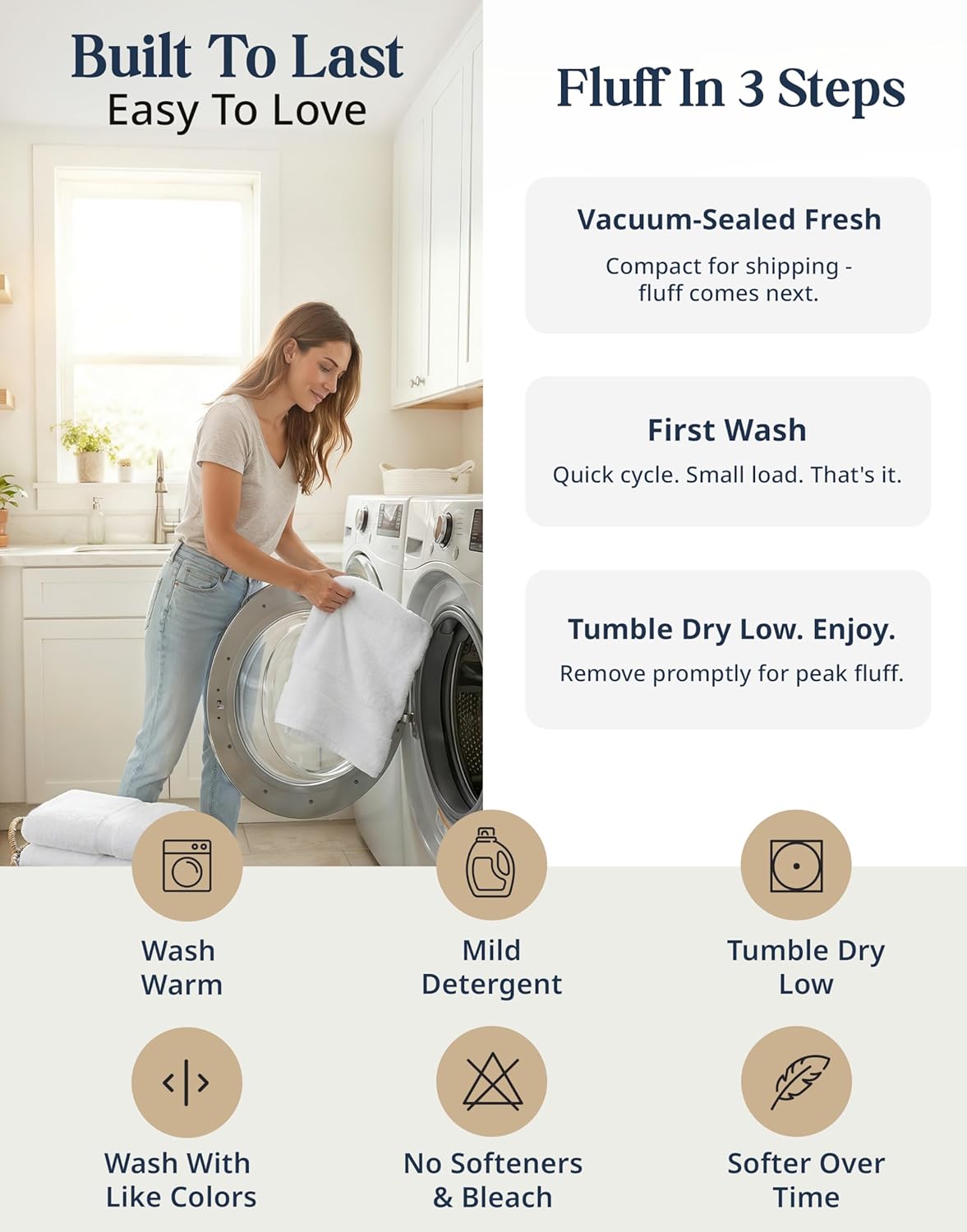 EASY CARE INSTRUCTIONS FOR EVERYDAY CONVENIENCE – Keep your towels fresh and fluffy with simple care — machine wash in warm water with mild detergent, and tumble dry on low. Avoid bleach and fabric softeners to maintain softness, absorbency, and vibrant color. These hand towels, and bath towels are built to last and get better with every wash.