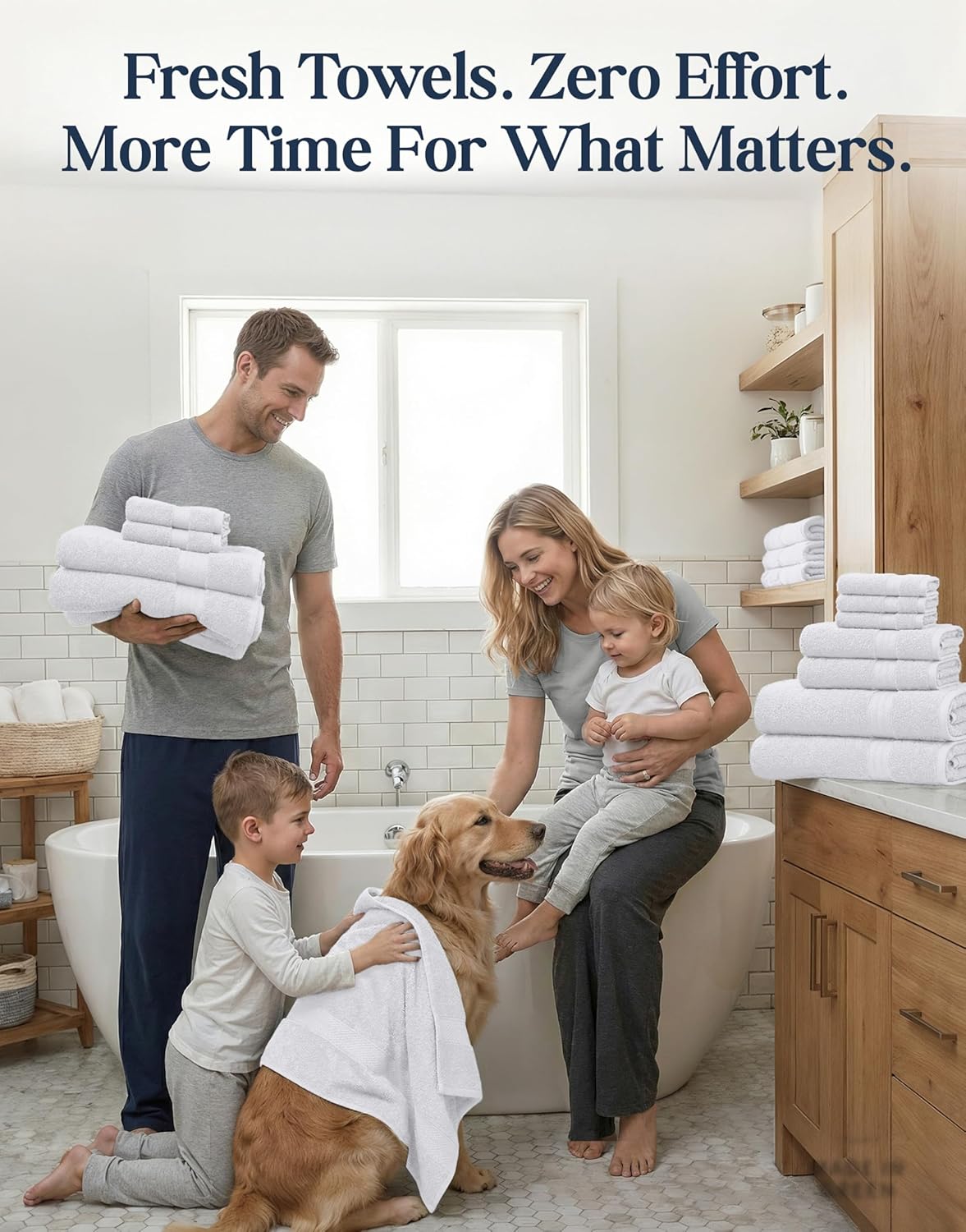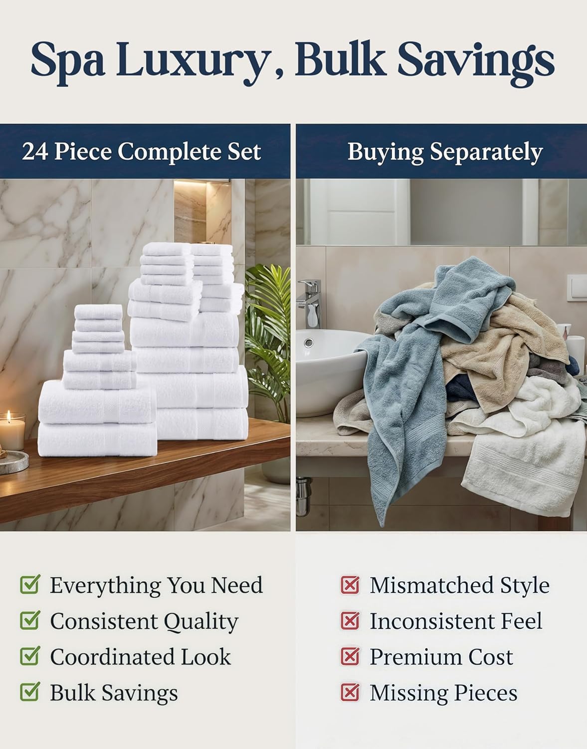 COMPLETE 24 PIECE TOWEL SET FOR BATHROOM – Transform your bath space with this luxury 24 piece towel set that includes: 2 Bath Sheets (35″ x 66″), 4 Bath Towels (28″ x 54″), 6 Hand Towels (16″ x 26″), 8 Washcloths (12″ x 12″), and 4 Fingertip Towels (12″ x 18″). Perfect for families, guests, or anyone upgrading their bathroom towels collection.