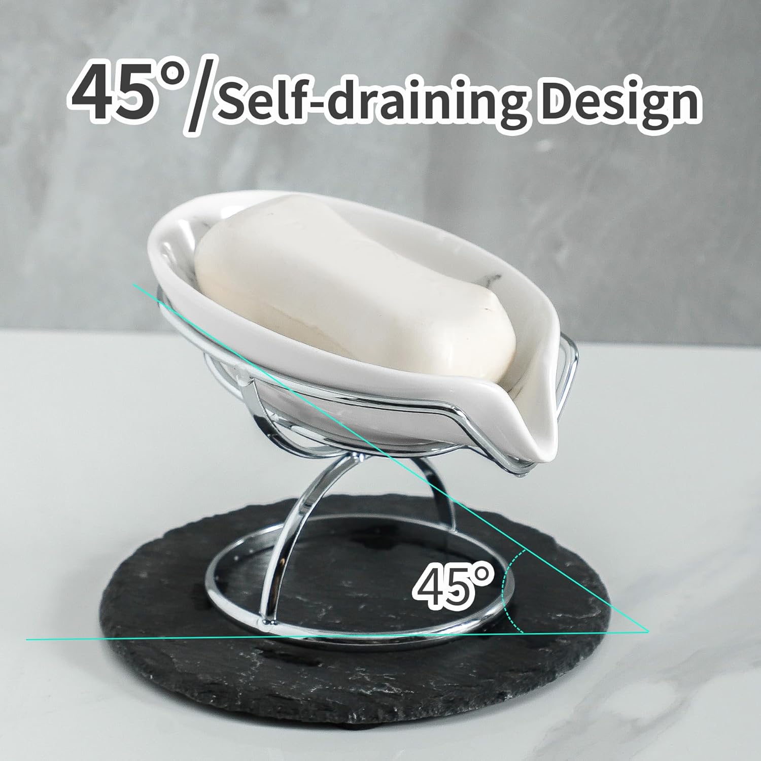 Leaf-Shaped Soap Dish – Premium Ceramic Soap Bar Holder with Self-Drainage System – Bar Soap Holder for Shower, Bathroom Sink, Kitchen – Waterfall Soap Dish with Stainless Steel Stand (SLIVER)