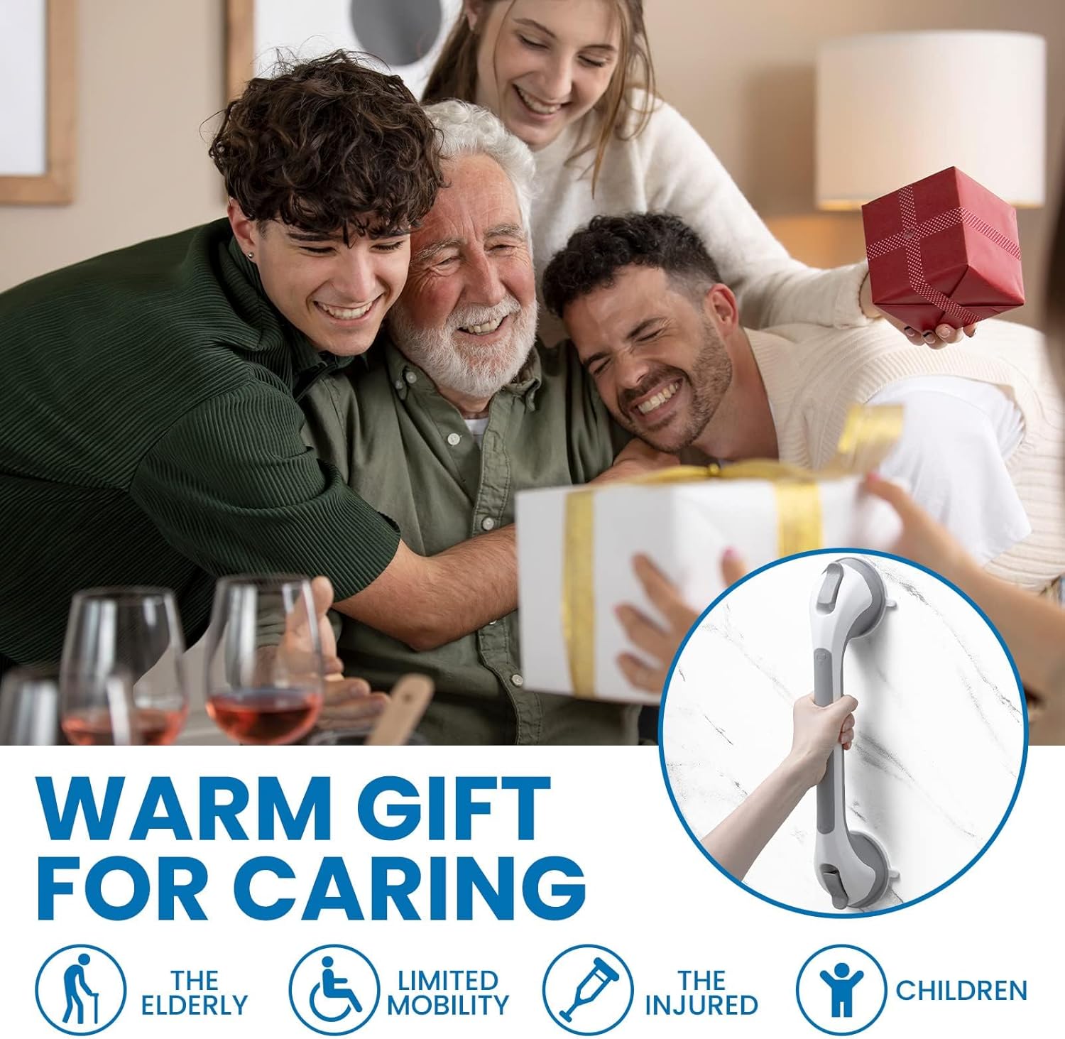 Unique Design: The Safety Shower Bars is fabricated with an Anti-Slip Strip on top of the handrail, which creates strong friction to better keep your hands ON the grab bar. On the bottom of the grip covers the curved wave design which is suitable for fingers, giving you double protection to guarantee safety and security. Also the bathtub handrail is lengthen designed so that it’s long grabbing grip is able to hold both hands
