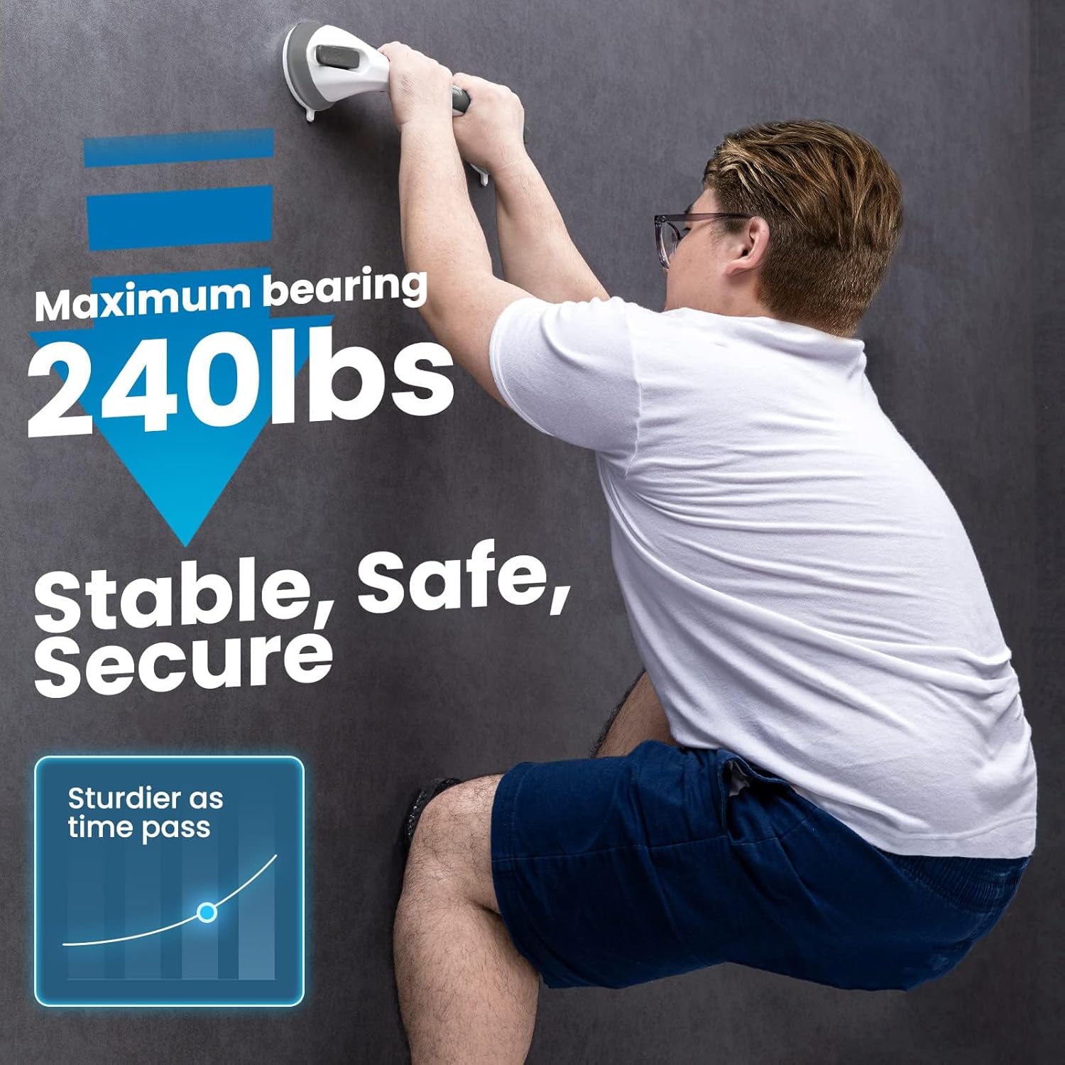Strong Suction: LEVERLOC patented suction cup shower grab bar applies octopus bionic technology, which can provide strong vacuum suction on wall and has maximum 240lbs heavy duty EACH, fully waterproof, staying sturdy and stable. Please make sure the grab bar for shower is adhered properly