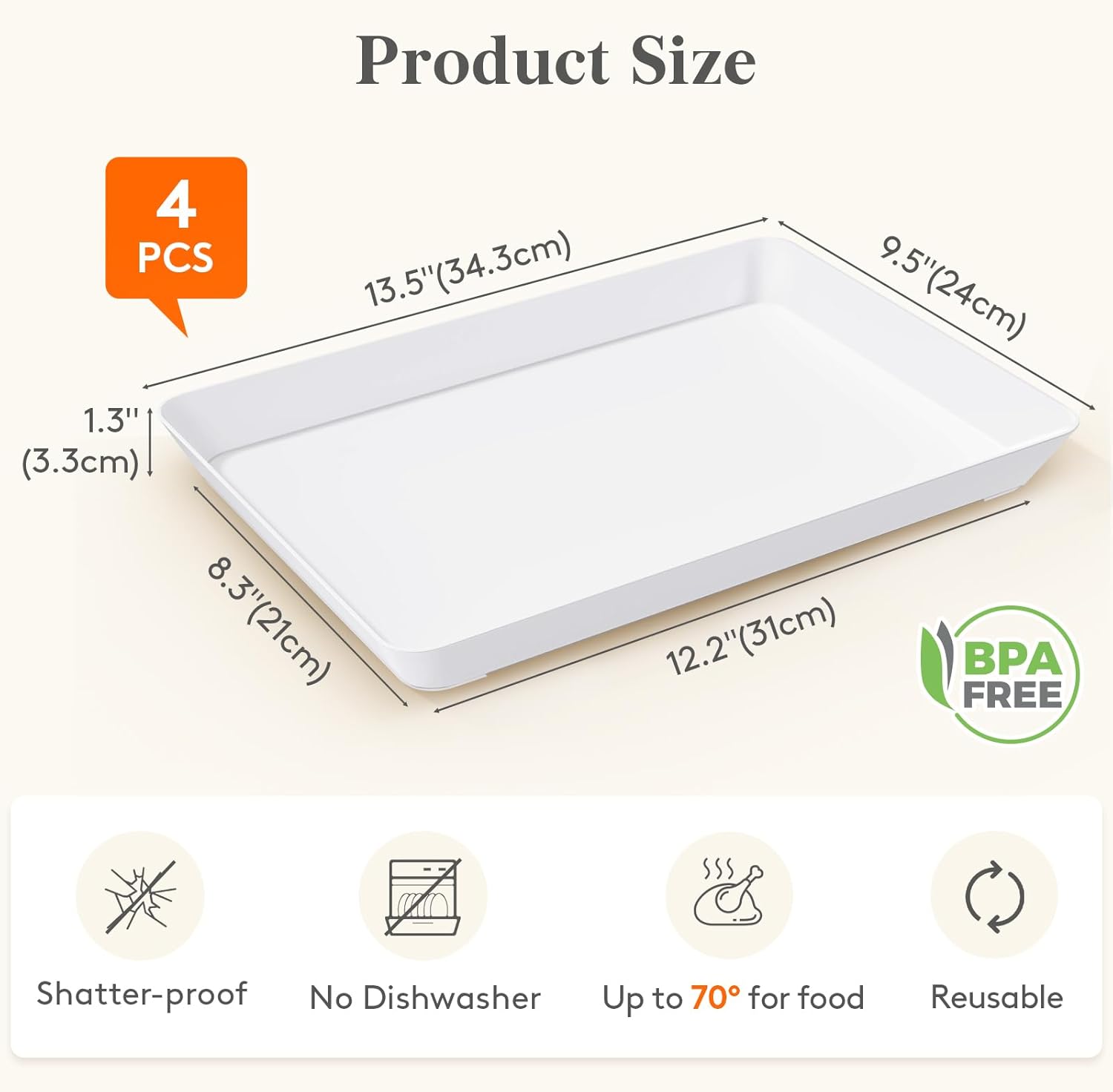 Large Capacity for Everyday Entertaining: Set of 4 platters featuring 13.5″ × 9.5″ top dimensions and a 12.2″ × 8.3″ base, designed with 1.3″ raised edges to help keep food in place. Ideal for serving warm dishes (below 70°C), small platters for vegetables, fruit platters, desserts, sandwiches, charcuterie, burgers, BBQ items, or an relatively small party spread. Plus, Larger sizes and more quantities are offered if you need more serving space
