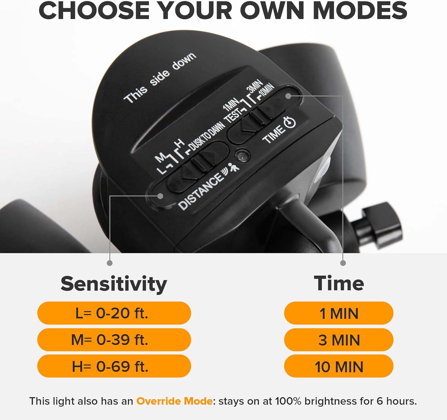 4 LIGHTING MODES: Test Mode, Security Mode, Dusk to Dawn Mode and Manual Override Mode. Manual override mode allows light to operate constantly for selected period of time (Flip the wall switch OFF-ON-OFF-ON within 3 seconds). More choices can meet different demand for each customer