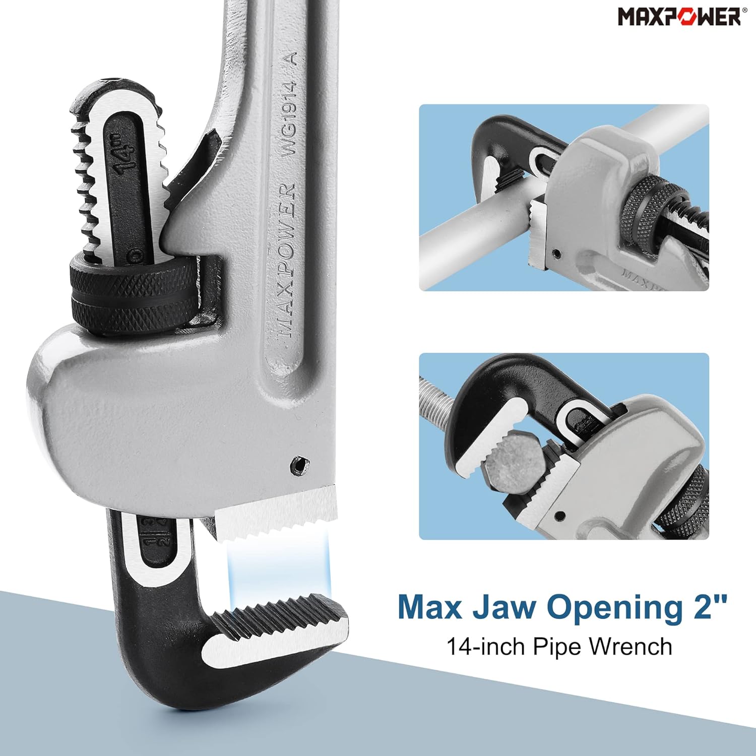 The 14 inch aluminum pipe wrench has an opening capacity of more than 2 inches.