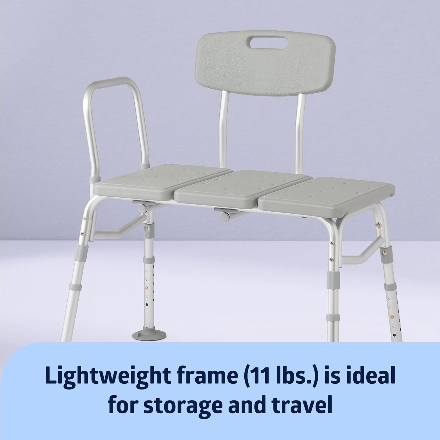 The Medline bathtub transfer bench for seniors and mobility impaired individuals provides customized assistance for showering and bathing. This durable, heavy-duty bench has a weight capacity of 400 lbs., and securely positions across the tub for easy transfer in and out of baths and showers. Adjustable seat height from 17.5-22.5” allows for a custom fit at half-inch increments. The backrest can switch from either side of the seat to accommodate any size shower or tub; a side arm comes standard for stability and leverage when sitting or standing up. Wide suction cup feet inside the tub grip securely to provide stability and confidence. Slip-resistant rubber feet outside the tub prevent sliding. The seat and backrest have convenient drain holes. Easy, tool-free assembly; overall dimensions 32”L x 18”W x 32.5- 36.5” (includes backrest). With over 100 years servicing the healthcare industry, you can trust Medline for accessible and independent bathing.