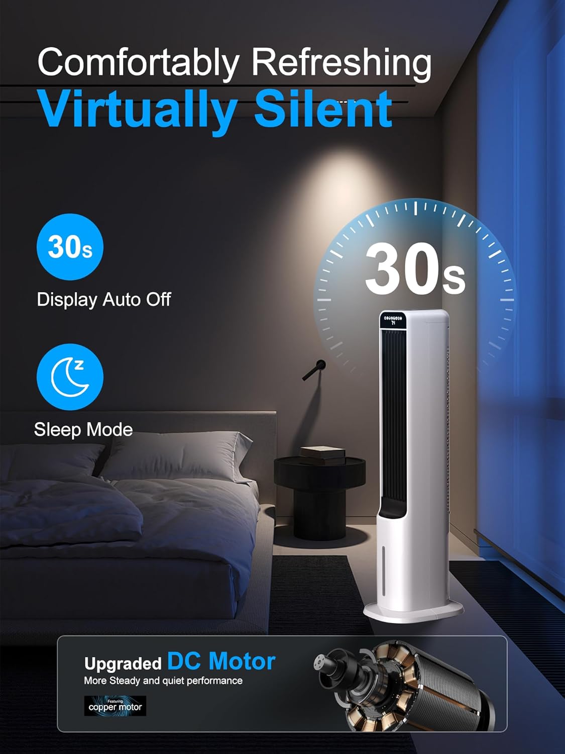 Personalized Comfort: Customize your comfort with three distinct modes (Normal, Natural, Sleep) and three adjustable speeds (Low, Medium, High). The Normal mode offers a steady, powerful breeze. The Natural mode mimics the gentle, fluctuating wind of the forest, adding a touch of nature to your space. And the Sleep mode ensures a quiet operation, guaranteeing you a peaceful night’s rest. Whether you’re working, relaxing, or sleeping, this cooler has got you covered.